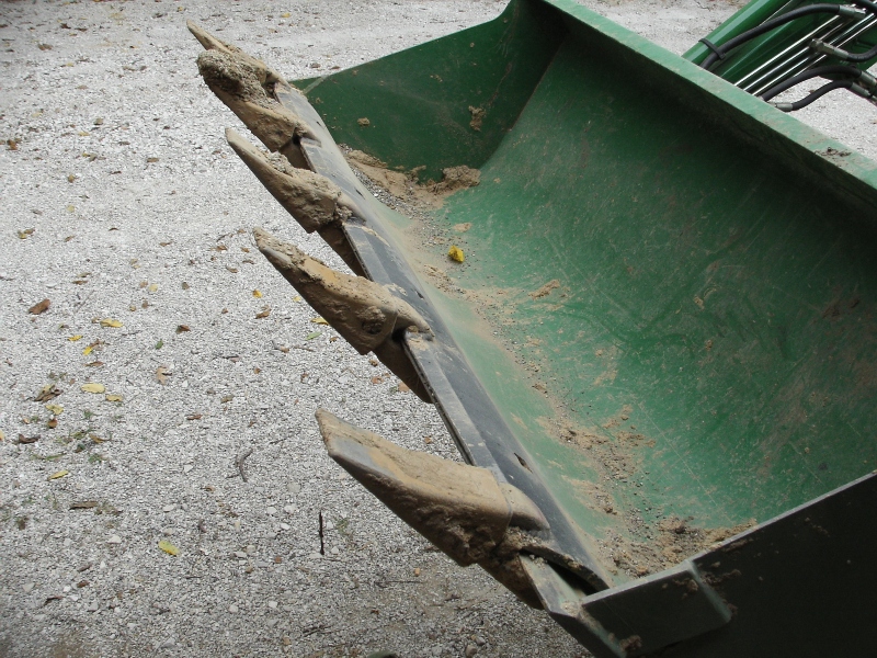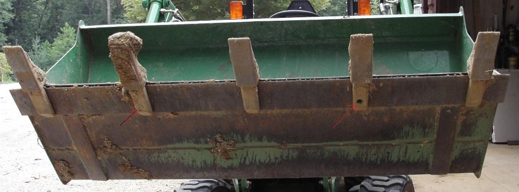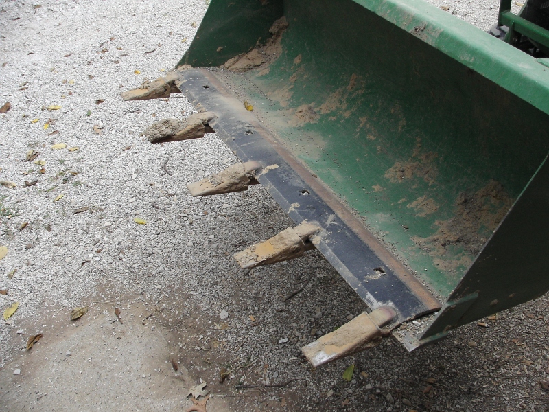 I found a local wear parts suplier that services the coal mines that has bin after bin of adapter shanks and teeth in stock. I found some "23 series" adapter shanks that fit the two wear edges and welded them to the top piece. The whole thing slides on from the front and is retained by two 3/8-16 allen head bolts that are recessed in the 2nd and 4th shanks through two holes in the bucket and treaded into the top wear edge.