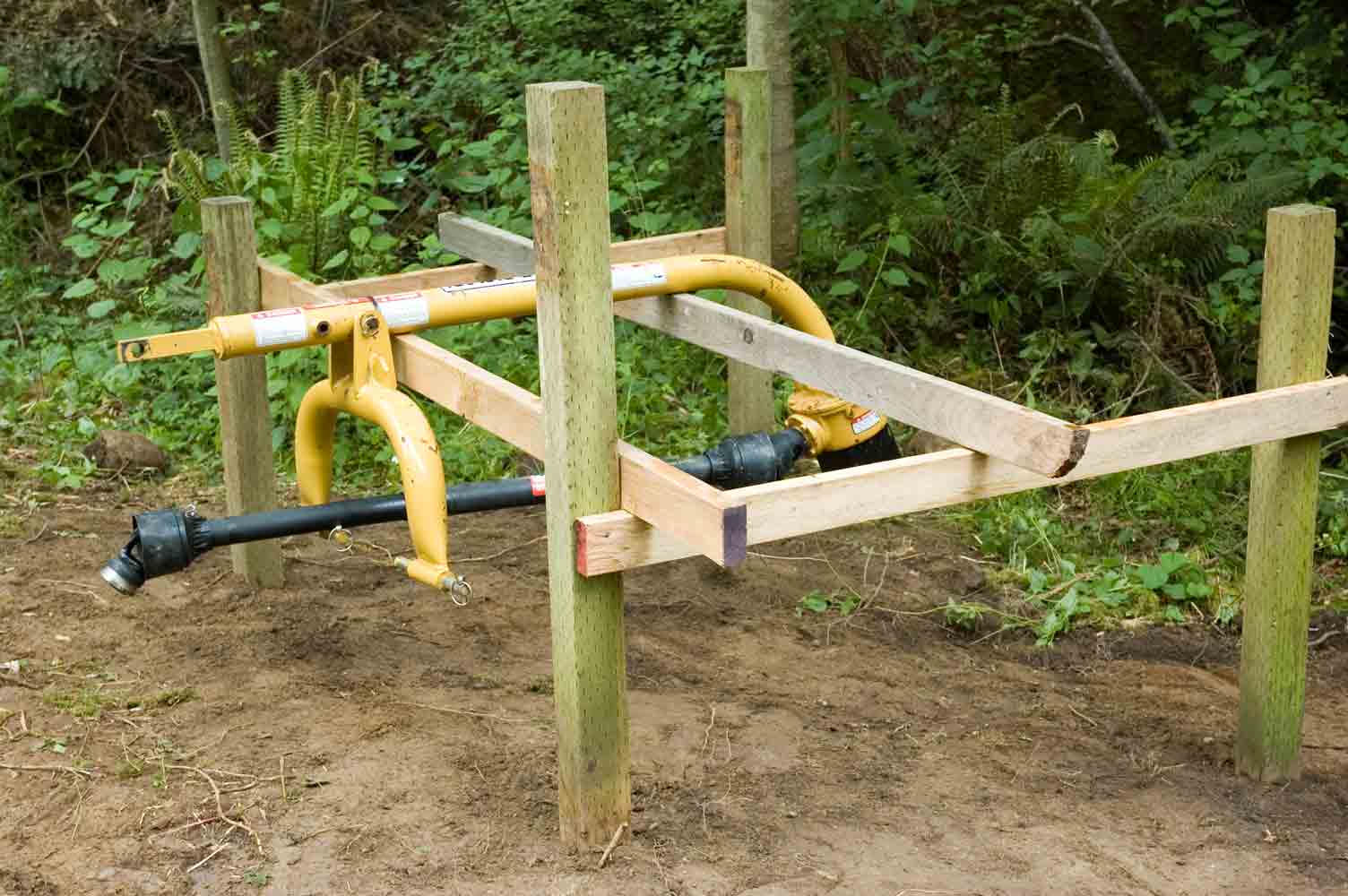 I made this rig using some left over 4X6 pressure-treated fence posts cut with my chain saw and cobbled together with some spikes. I had some coated chain and a couple of screw eyes. I used a snap hook that make it very easy to hook up to hanging chain. I also wrapped a piece of chain around the PHD support arm to keep the unit stabilized when being moved. The setup balances the unit very nicely. It can be moved into position with one hand. The stabilizer chain also keeps the unit from moving around in the wind.