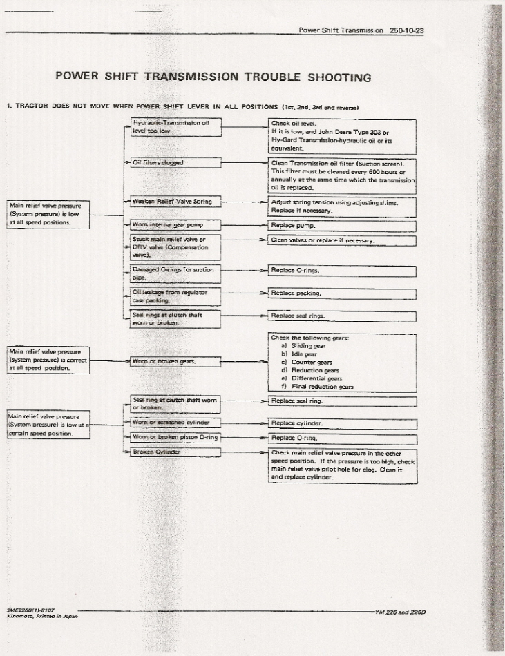 yesterday, with info from this site, I cleaned the hydraulic system screen and changed the oil in the hydraulic system. I am assuming that the transmission and rear hydraulocs are all the same. This didn't seem to make any difference. The tractor will still move a little but it acts just like a car with a badly slipping automatic. I drove it downhill a ways from my barn after changing the fluid but it wouldn't come back up the slight incline on it's own. I had to tow it back to the barn with my pickup. One other weird thing I noticed was when I accidentally left it in gear, the rear wheels were locked upand wouldn't turn at all.
