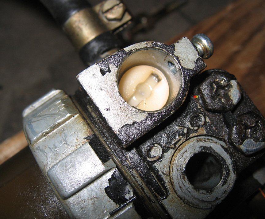 This may not help with your primary problem of starting the tractor, but I happened to replace my fuel bowl assembly recently and had some pictures handy showing the little screw and groove. This is the old damaged one.