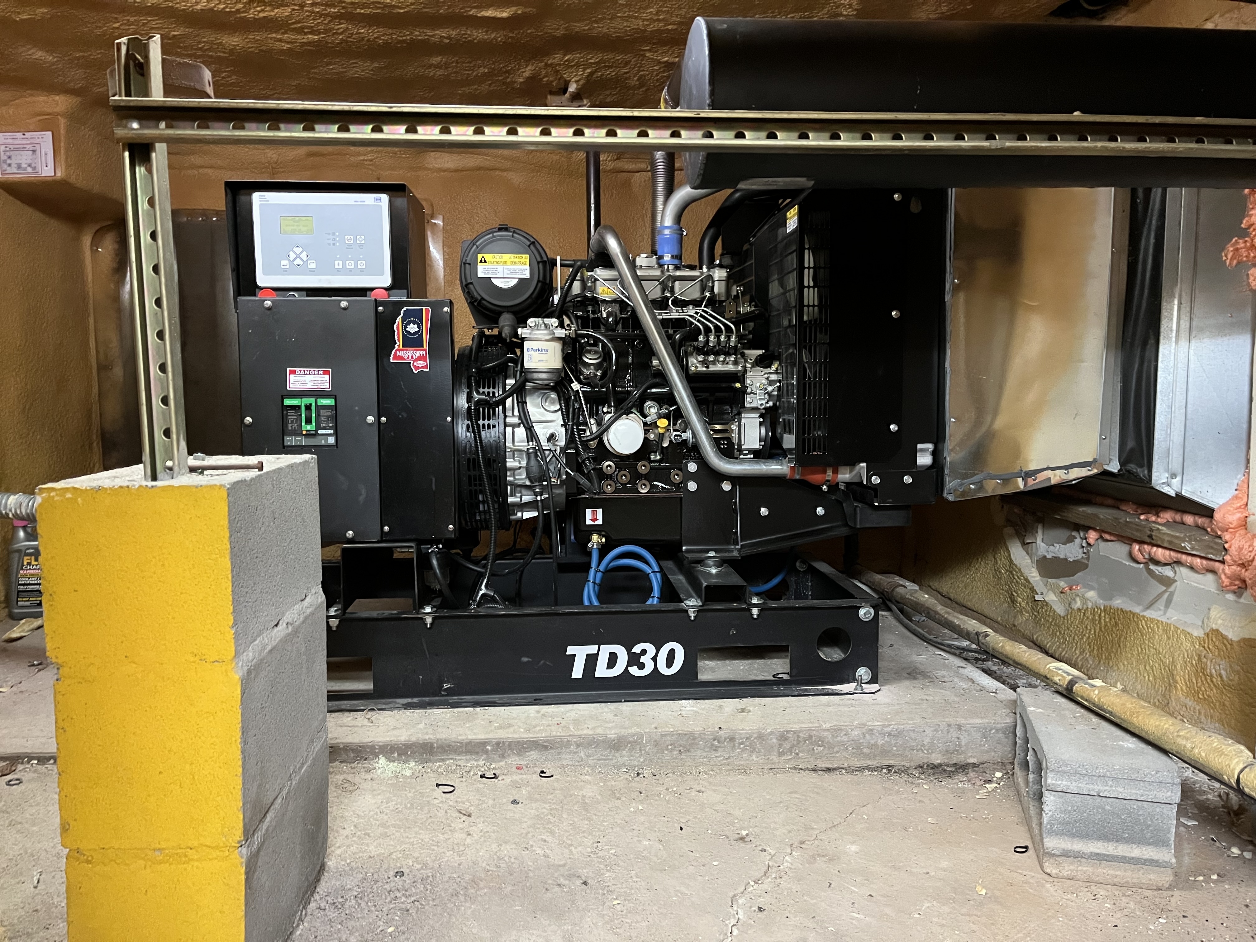 Taylor Generator with a Perkins engine. Used the same transfer switch as the old one. Seems a bit quieter than the old JD. And yes, it’s installed in a crawl space.