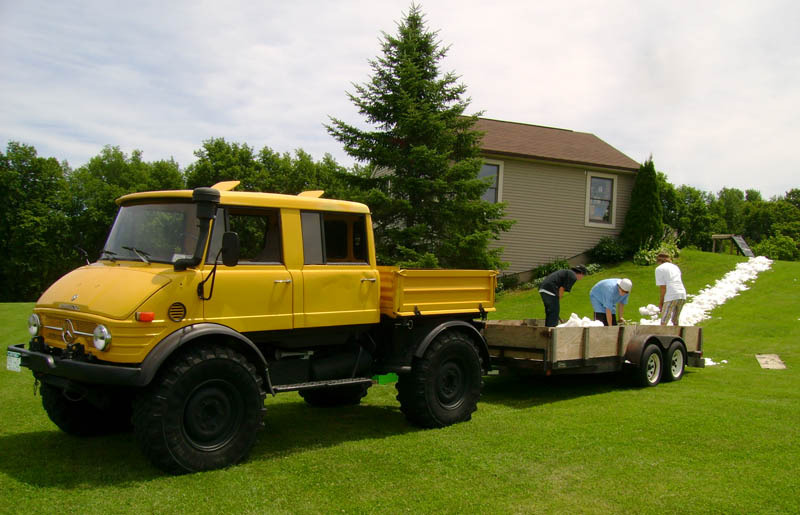 My 1973 Unimog 416 Doka hauling some snow, so the boys can practice snowboarding during the summer! They just raid the local ice rink for the snow.