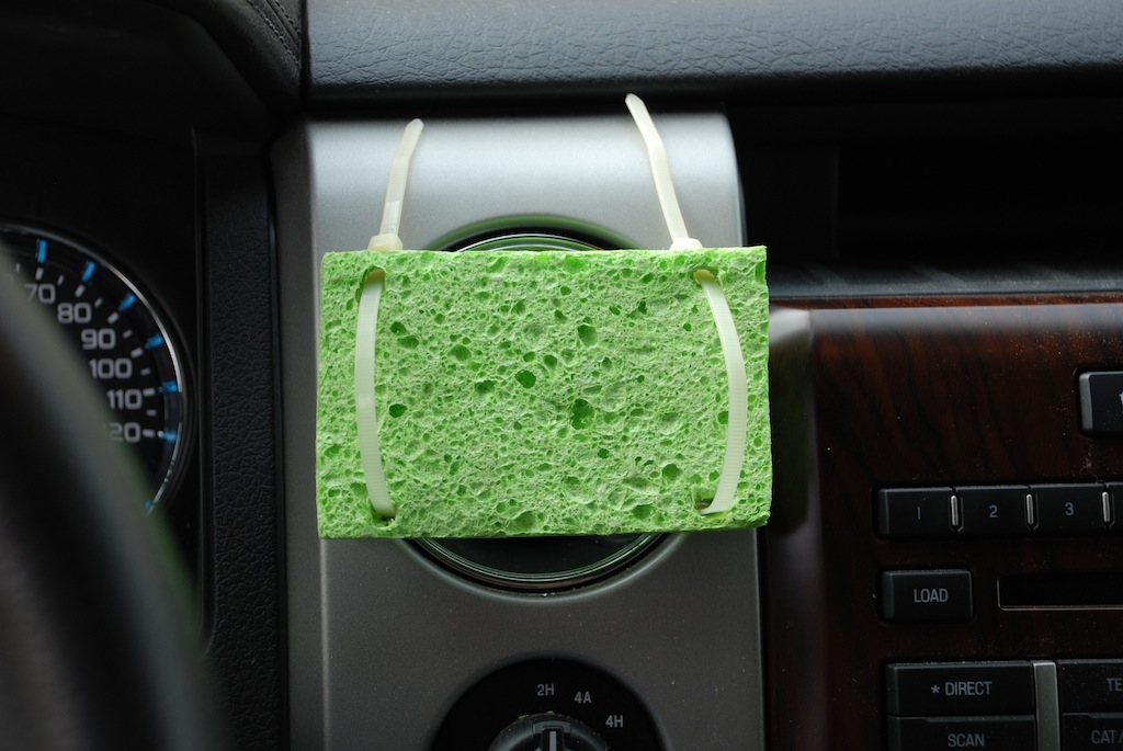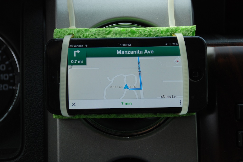 I looked for cell phone mounts for my pickup, but they all seem to have disadvantages. I couldnt find one I wanted to buy, especially not for $30-$40 dollars. So I made one. I've used this cell phone mount for about a month on all kinds of roads, with no issues. Nothing to fall off, no threads to strip, fits the phone perfectly, easy to mount and remove the phone, it doesn't sag or rattle, and it is located perfectly in my field of vision but unobtrusive. It is not real pretty but now that I know it works, I am planning to upgrade to black zip ties and maybe a silver sponge.