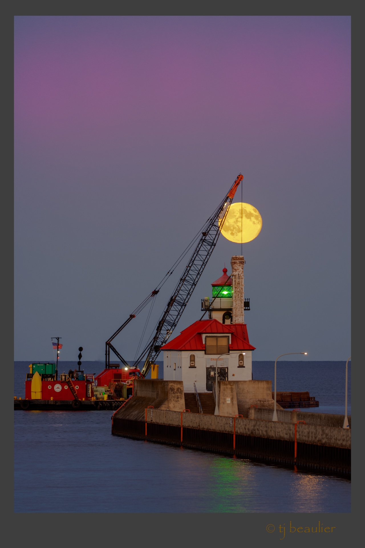 Our town: "Setting" the rising Falling Leaves moon (binaakwii-giizis) Duluth, MN. Dredge working just off the pier.