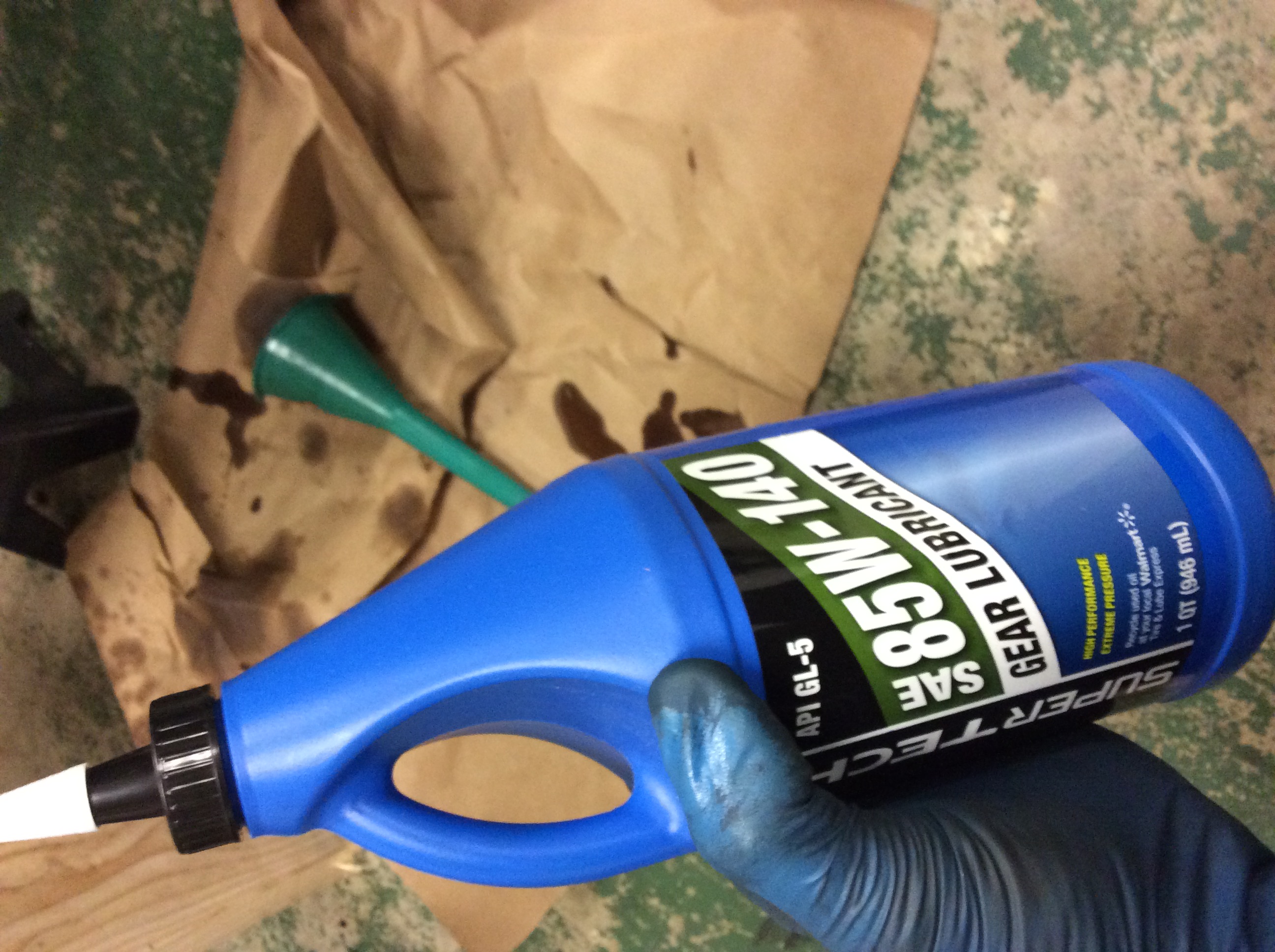 Putting gear oil in the front diff and out drives. They had gear oil in them when I drained them, so I went back with the same. It took exactly four quarts.