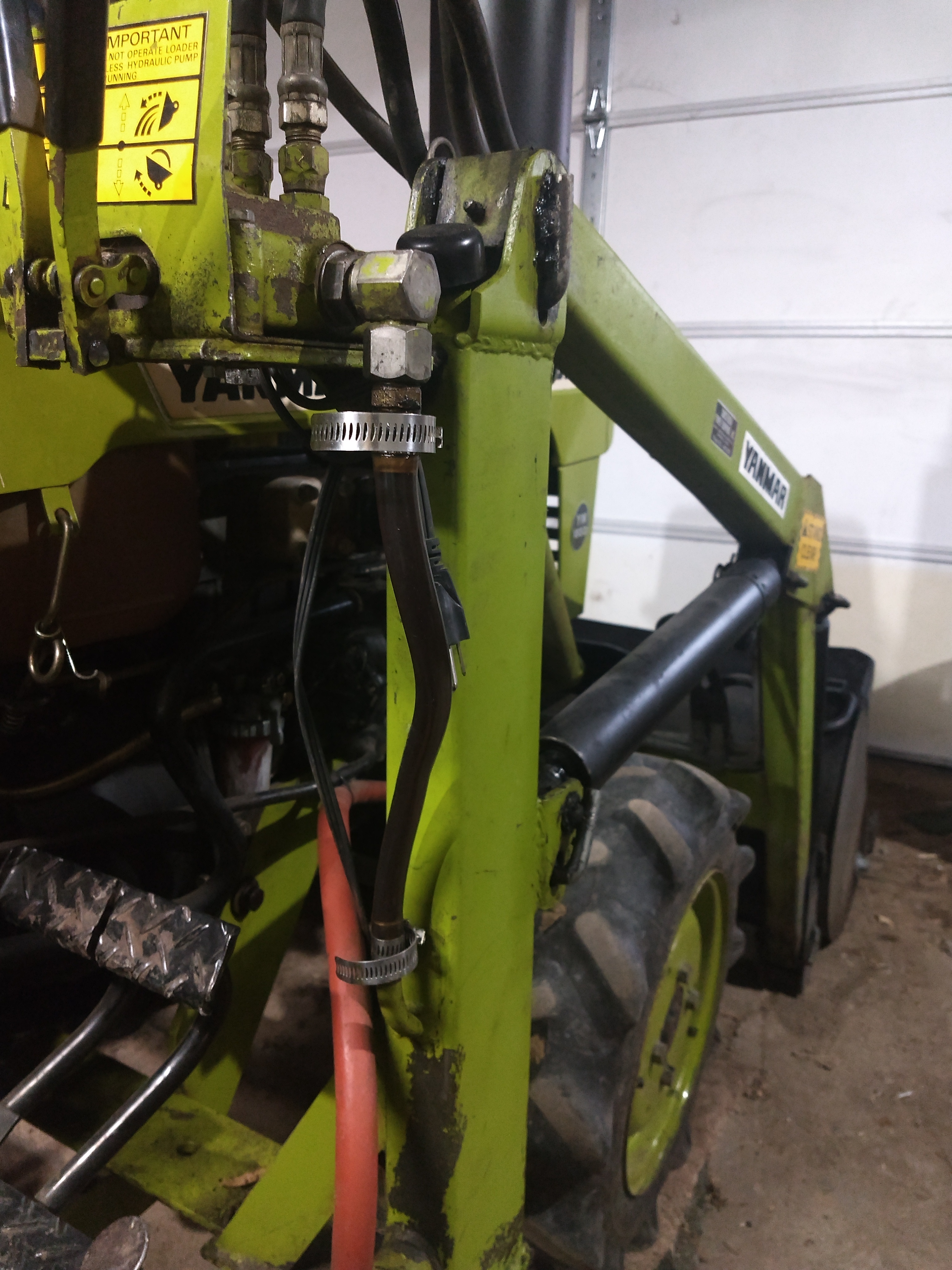 The short answer is that the loader valve in your photo is hooked up poorly for use with the accessory hydraulic pump. The "OUT" port - not the PB port - should be going to the top of the oil reservoir in the loader upright. See my photo below