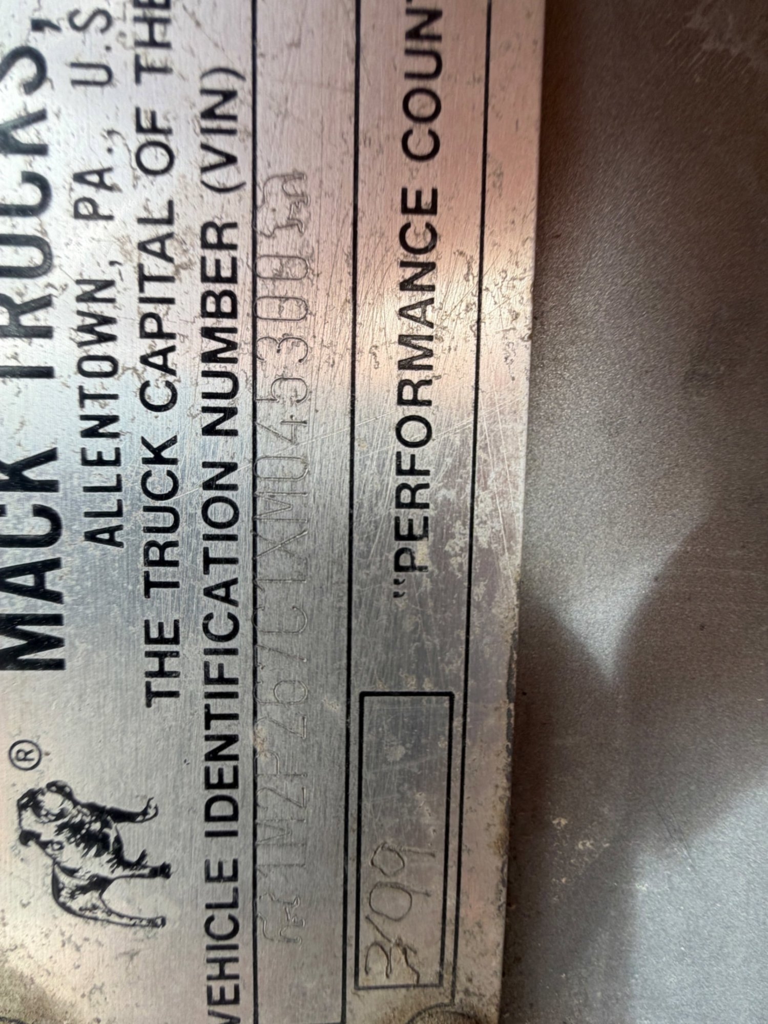 (Cleburne. TX) VIN/SN: 1M2P267C1XM045300, Engine: MACK E7, Engine Starts: YES, Odometer Reads: 145,223 Miles, Meter Reads: 68,456 Hours, Transmission: 10 SPEED MANUAL, Suspension: CAMELBACK , HOOD BROKEN