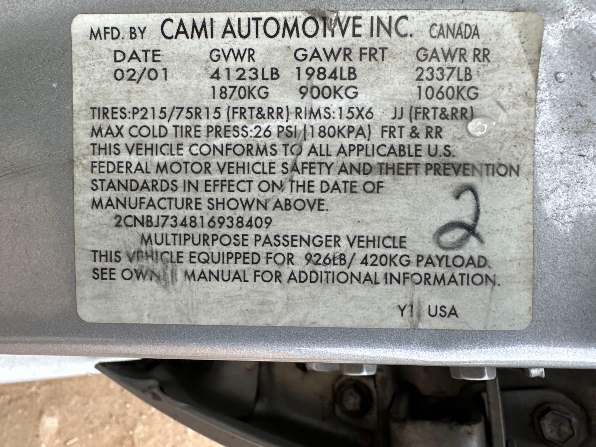 2001 Chevrolet Tracker Multipurpose Vehicle (MPV), VIN # 2CNBJ734816938409