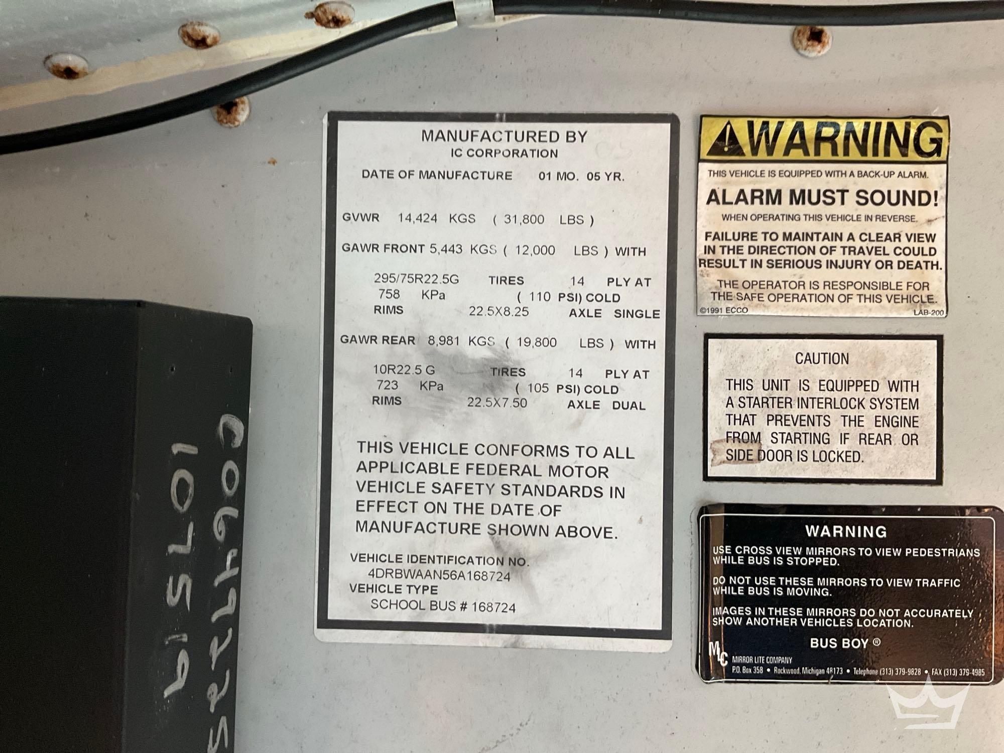 (*SELLING OFFSITE IN FT. MYERS, FL) Lee County School Board (63130) VIN:4DRBWAAN56A168724 Odom Reads 270,212 miles, pwd by International 7.6L 6-cylinder diesel engine, Allison transmission. Equipped with: 78 max passenger seating, GVWR 31,800lbs, front GAWR 12,000lbs, and rear GAWR 19,800lbs, emergency exits, bi-fold doors, air brakes, AC/heat. Runs and drives. Limited function check completed during check in.