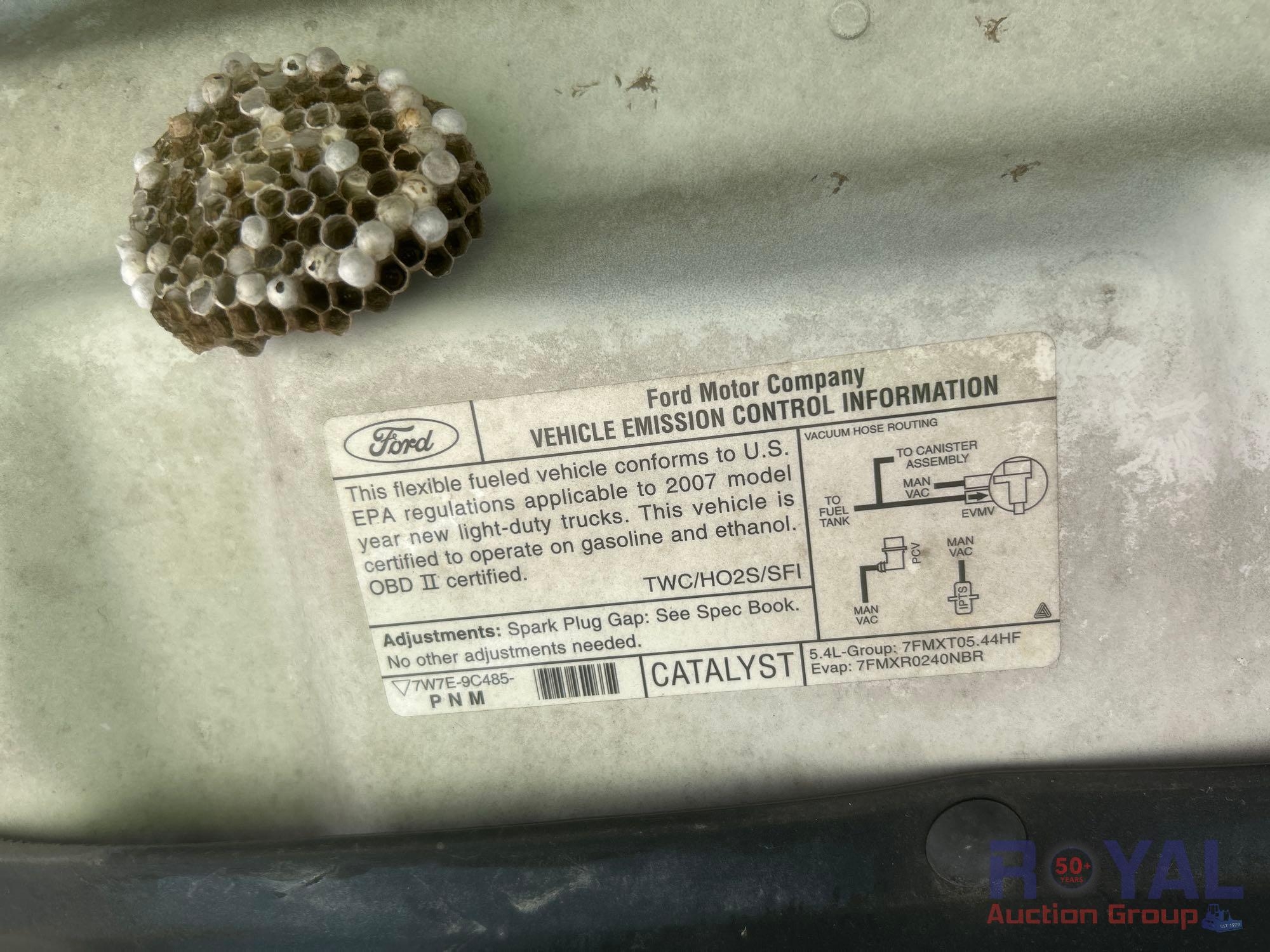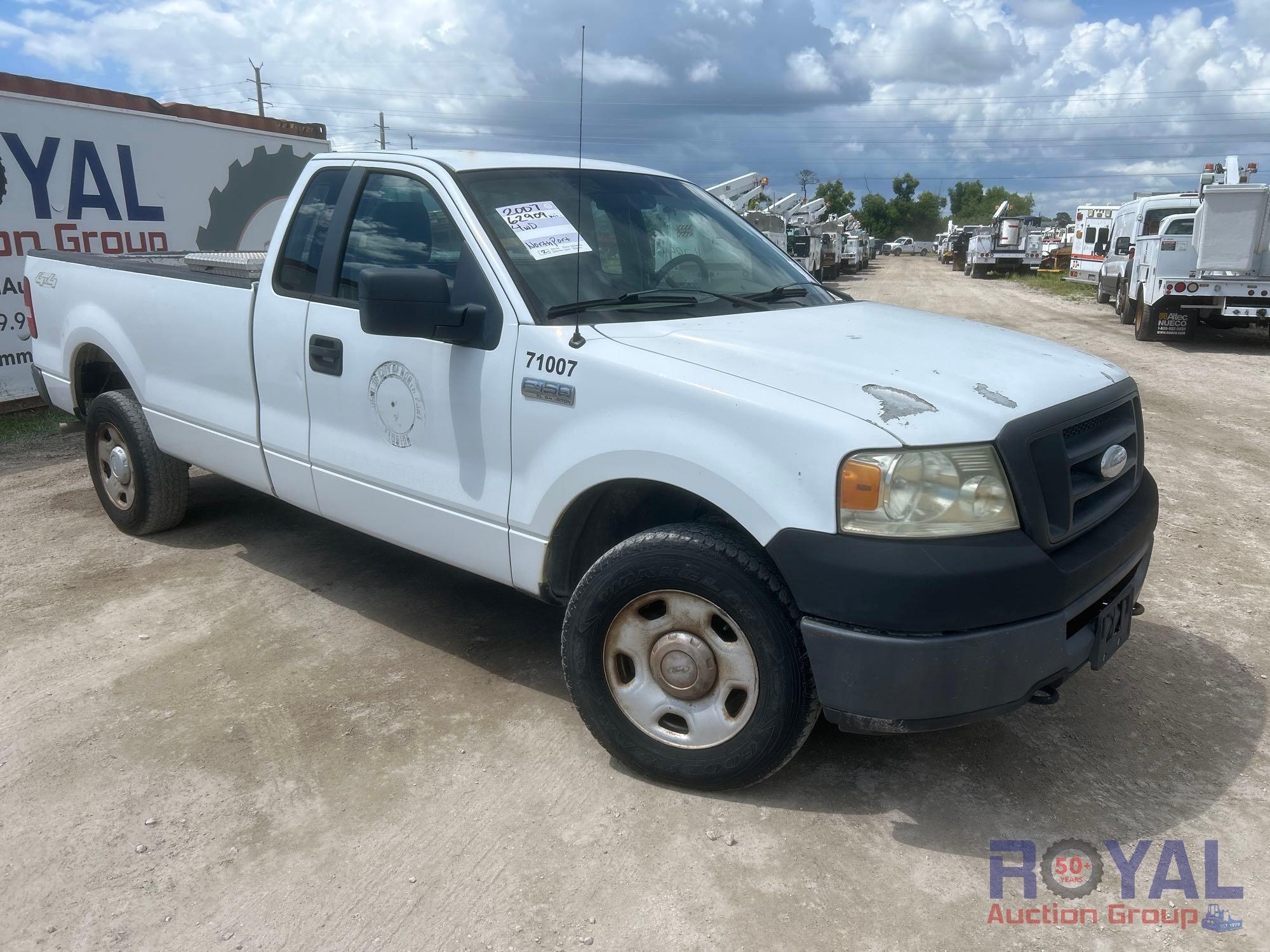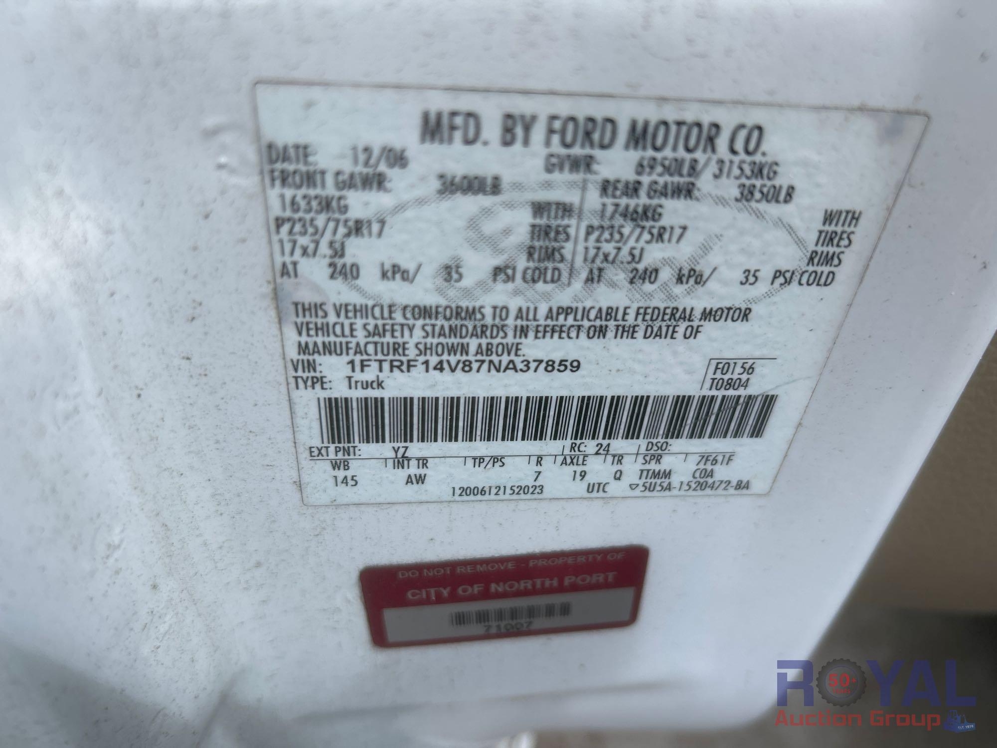 City of North Port (71007); VIN: 1FTRF14V87NA37859 Odom Reads 62,909 miles, pwd by 5.4L V8 gas engine, automatic transmission. Equipped with: four wheel drive 4WD, tow package w/ ball hitch, tool box, pwr windows, mirrors and locks, cruise control, am/fm stereo, AC/heat. Runs and drives. Limited function check completed during check in.