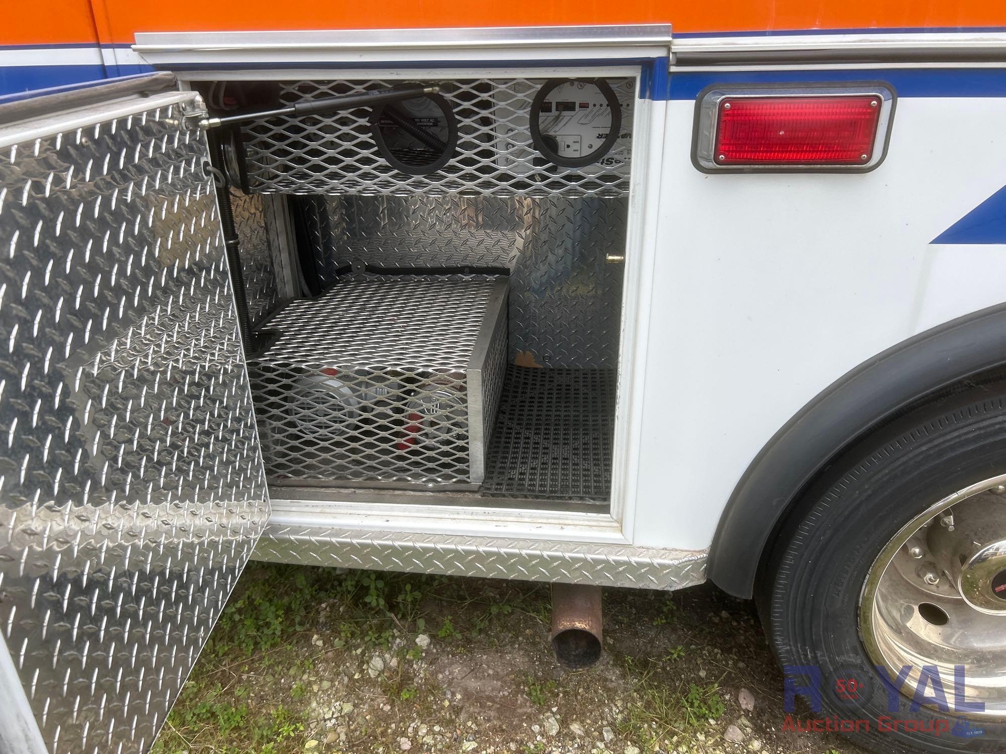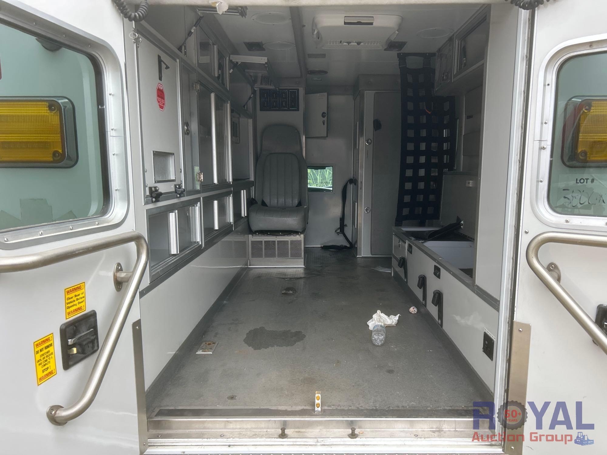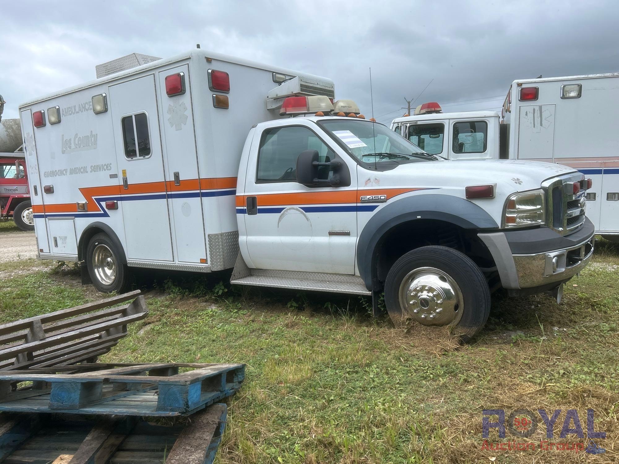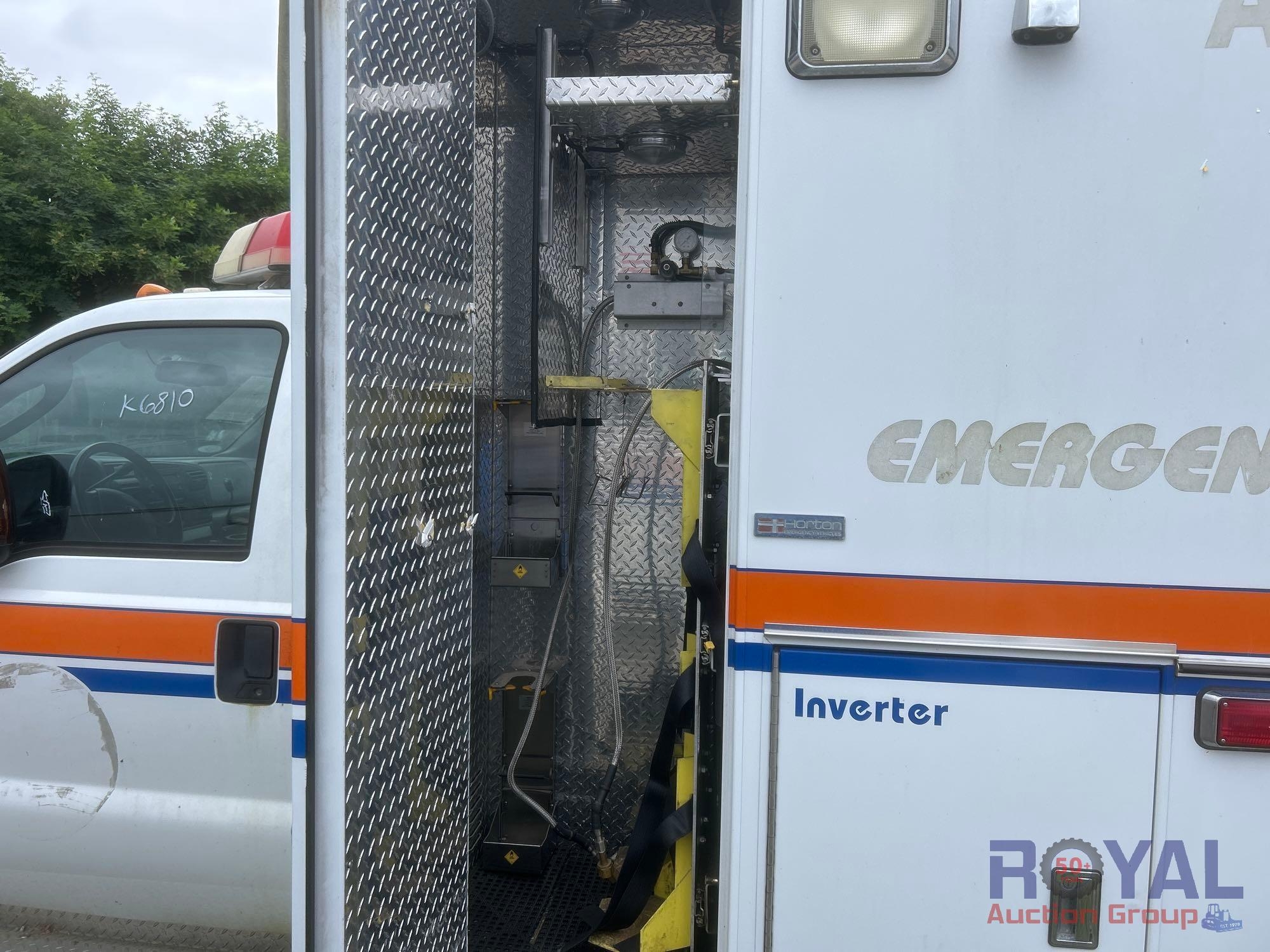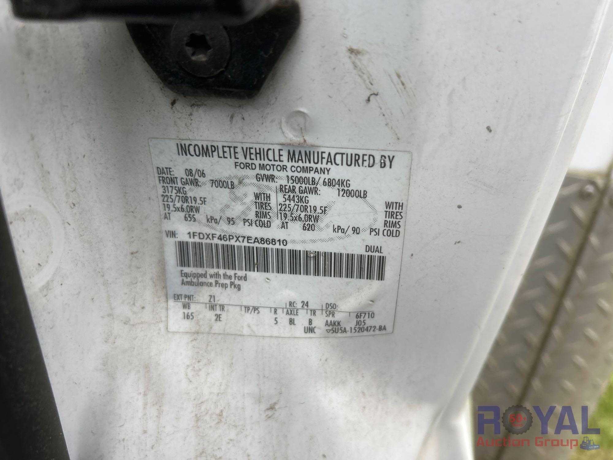 VIN:1FDXF46PX7EA86810 Odom Reads 135,906 miles, pwd by Powerstroke 6.0L V8 turbo diesel engine, automatic transmission. Equipped with: ambulance body package, paramedic and passenger seating, interior and exterior storage compartments, GVWR 15,000 lbs, Horton emegency vehicle control panel, emergency lights and siren, pwr windows, mirrors and locks, auxiliary switches, cruise control, am/fm/cd stereo, AC/heat. *Non-Runner*