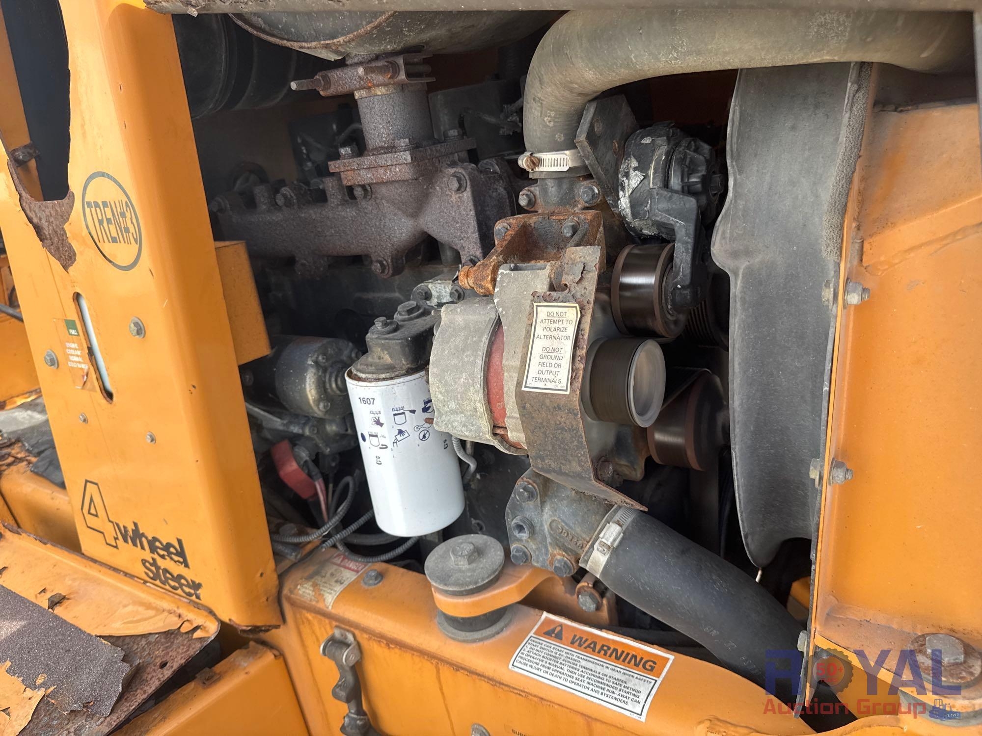 PIN: RT660X44161, hour meter reads 961 hours, pwd by Cummins 67 hp 4-cylinder diesel engine. Equipped with: four wheel drive 4x4, four wheel steer, rear Case H939184 trencher attachment, 72 in digging depth, front attached D125 backhoe with tooth bucket, two hydraulic outriggers, knock down blade, OROPS, hydraulic lever controls, left and right entry/exit. Runs and drives. Limited function check completed at check in.