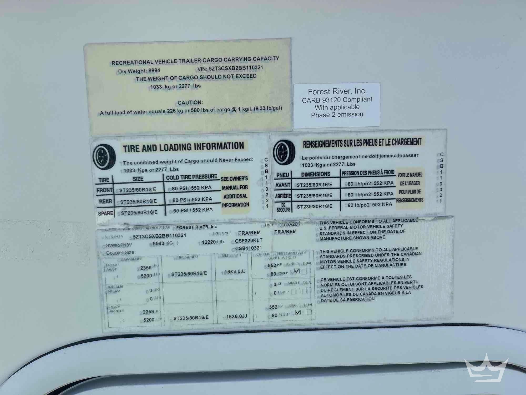 **SELLING AT ROYAL AUCTION GROUP ZEPHYRHILLS, FL LOCATION** VIN: 5ZT3CSXB2BB110321 GVWR 12,220lbs. front GAWR 5,200lbs. rear GAWR 5,200lbs. Equipped with 60 gallon fresh water capacity, 70 gallon gray water capacity, 35 gallon black water capacity, 60lbs. propane capacity, 6 gallon water heater capacity, front and rear leveling jacks, 3 slide outs, 6 person sleep capacity, kitchen dinette with bench seating, stove, oven, microwave, refrigerator/freezer, upper and lower cabinet storage, bedroom with closet storage, bathroom with shower, vanity and toilet. Limited function check completed at check in.