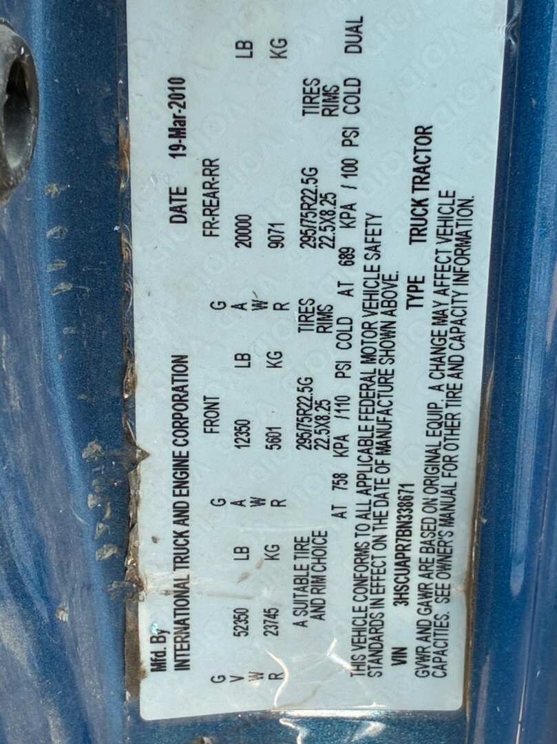 (Carthage. TX) 2011 INTERNATIONAL PROSTAR VIN/SN: 3HSCUAPR7BN338671, GVW:52,350, ENGINE:ISX 435ST, ODOMETER READS 657,780 MILES, TRANSMISSION:MANUAL EATON FULLER 10 SPEED, SUSPENSION:AIR RIDE, ENGINE STARTS:YES, 12,350 FRONT, 20,000 REARS, EXTRA PASSENGER SEATS, CRANKS AND DRIVES.ITEM# 18806