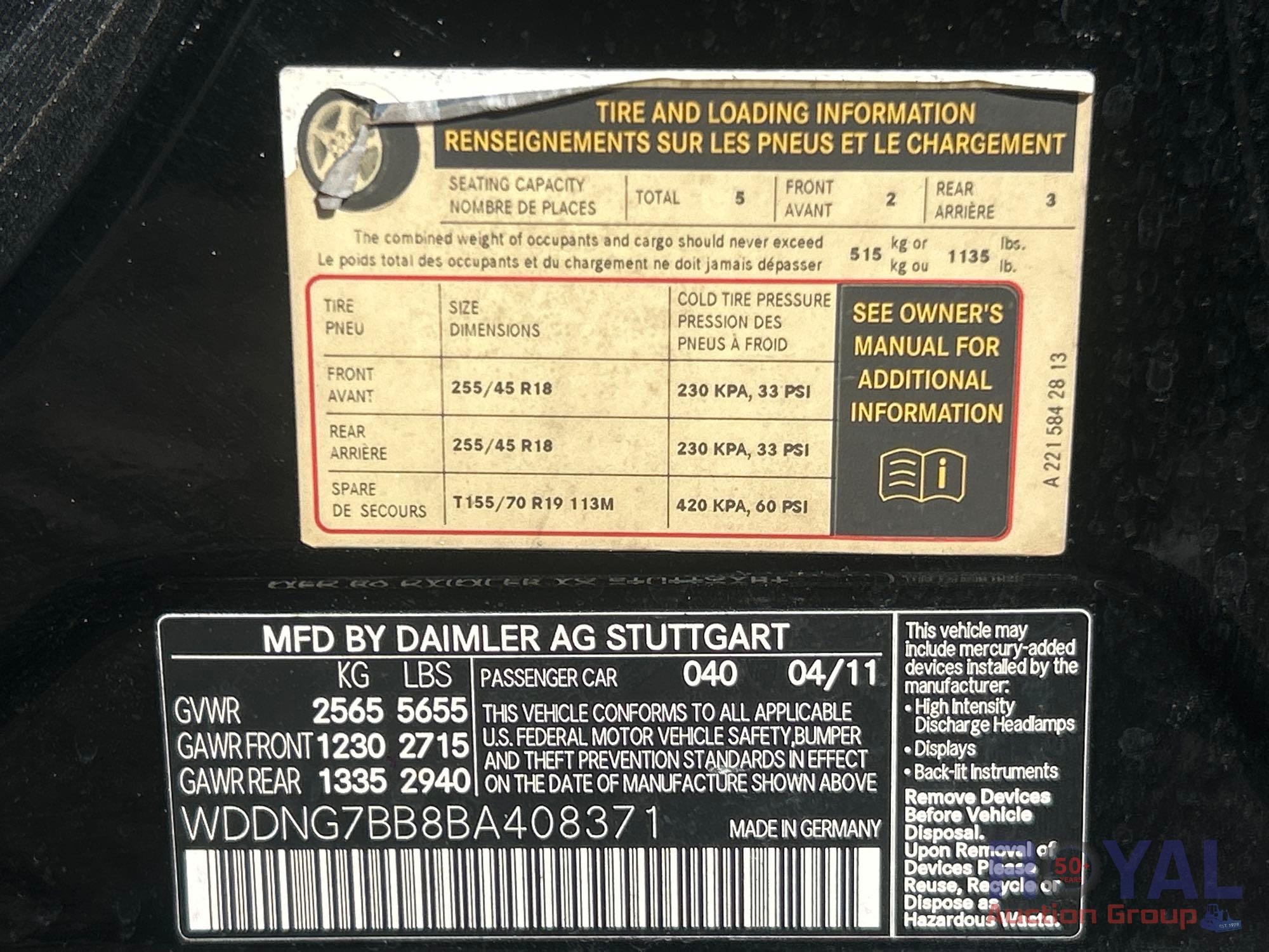 VIN:WDDNG7BB8BA408371, Odom reads: 97,673 miles. Powered by a 5.5L V8 gas engine with an automatic transmission. Equipped: pwr windows, locks, mirrors, seat, dash screen, sliding sunroof vent cover, tilt front headrest, bluetooth connectivity, steering wheel phone, cruise, dash, and media controls, heated steering wheel, am/fm stereo, digital infotainment system, dual climate control, and 12v charger. Runs and drives. A limited function check was completed at check-in.