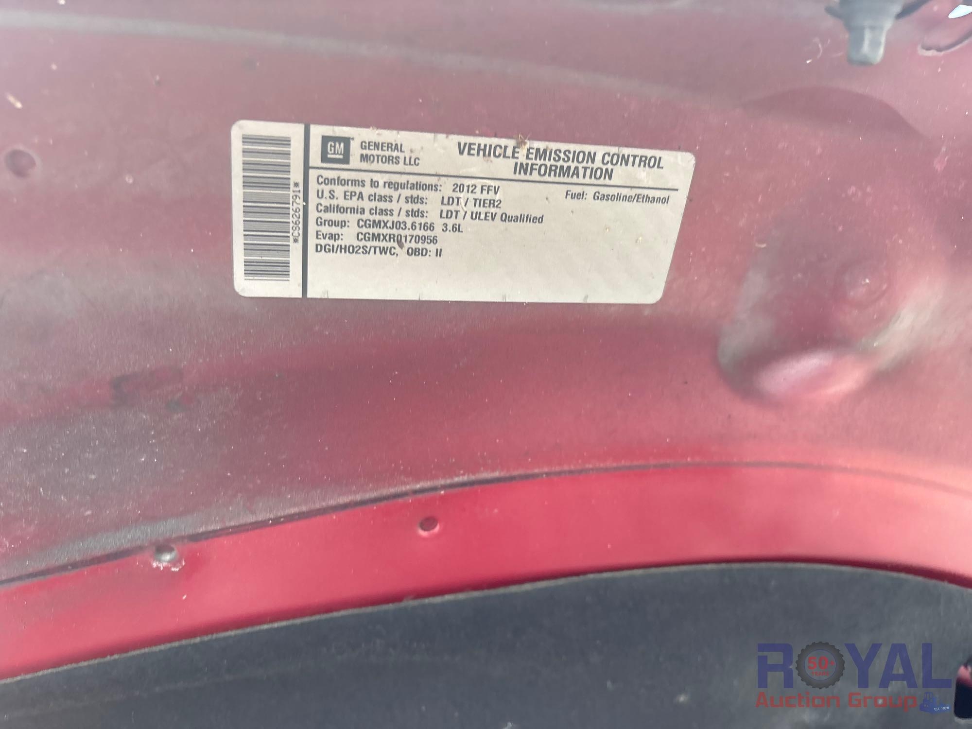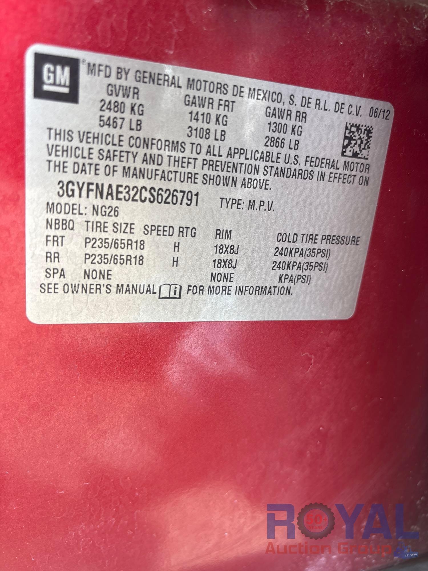 VIN:3GYFNAE32CS626791, Odom reads: 115,286 miles. Powered by a 3.6L V6 gas engine, automatic transmission. Equipped with: pwr windows, locks, mirrors, seats, dash screen, keyless ignition, handsfree phone connection, steering wheel phone, cruise, dash, and media controls, am/fm stereo, bluetooth connectivity, digital infotainment system, dual climate control, heated seat, and 12v charger. Runs and drives. Limited function check completed at check in.
