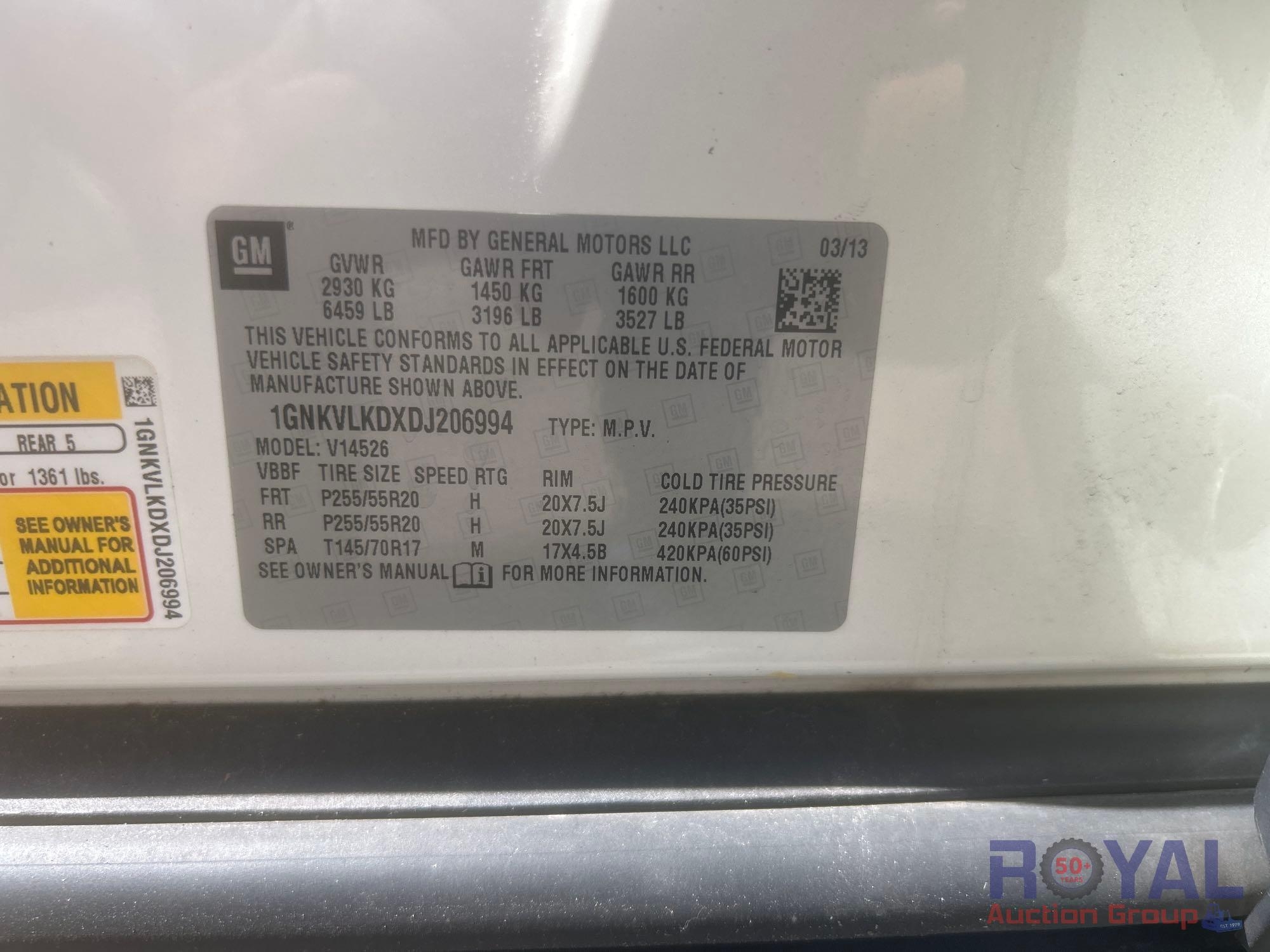 VIN:1GNKVLKDXDJ206994, Odom reads: miles. Powered by a 3.6L V6 gas engine with an automatic transmission. Equipped with:All wheel drive/AWD, 3rd row seating, 7 passenger seating, rear backup assist camera, running boards,sunroof with screen,wheel phone, cruise, dash, and media controls, am/fm stereo with cd player, digital infotainment system, rear Panasonic entertainment screen, dual climate control, rear climate control, and 12v charger. Runs and drives. A limited function check was completed at check-in.