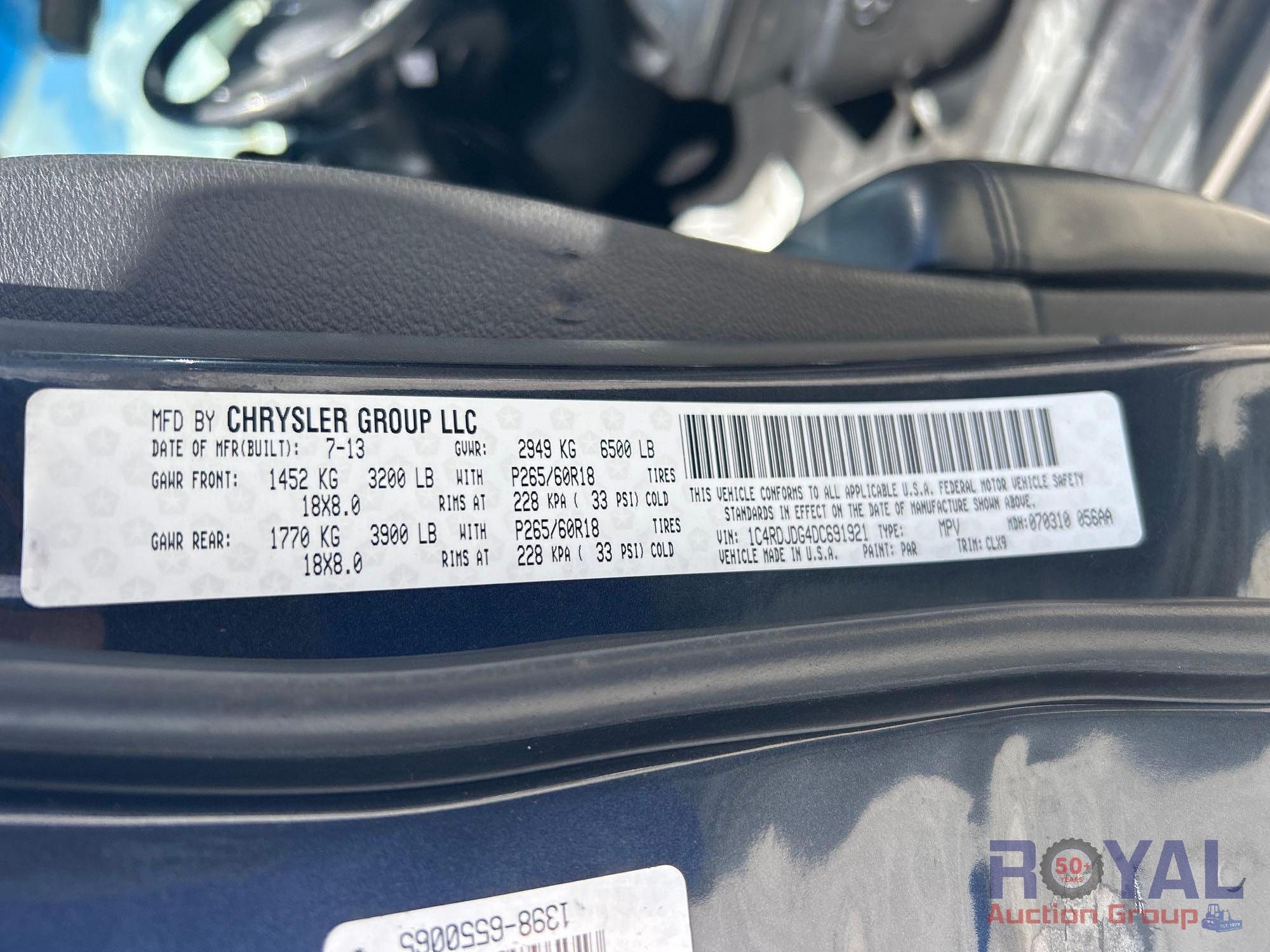 VIN: 1C4RDJDG4DC691921 Odom Reads: 249,919 Miles. Pwd by 3.6L V6 gasoline engine, Automatic transmission, Equipped with AWD/All Wheel Drive, third row compatible, pwd seats with heat, pwd windows, locks, and mirrors, steering wheel cruise controls and hands free capabilities, Bluetooth compatible AM/FM stereo with CD player, rear view camera, dual and rear climate controls, heat and A/C, Runs and Drives. Limited Function Check Completed At Check In.