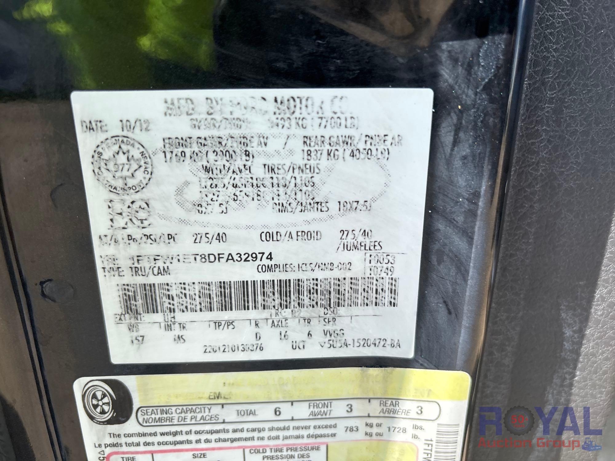 VIN: 1FTFW1ET8DFA32974, odom reads 142,202 miles, pwd by 3.5L V6 turbo gas engine, automatic transmission. Equipped with: four wheel drive, 4WD, tow package, nerf bars, bedliner, crew cab, pwr seat, windows, locks, and mirrors, handsfree phone capable, steering wheel phone, cruise and media controls, trailer brake controls, AC/heat, am/fm/cd stereo, USB connection, 12V ports. Runs and drives. Limited function check completed at check in. Rebuilt title, Other jurisdiction brands OH-salvage, may have been previously been declared a total loss vehicle due to damage.