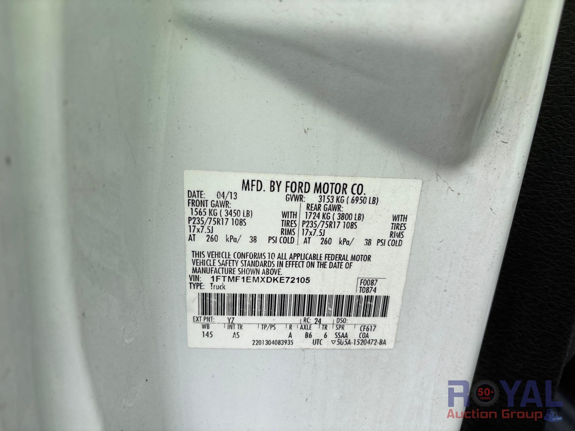Charlotte County BOCC, VIN:1FTMF1EMXDKE72105, Odom reads: 40,350 miles. Powered by a 3.7L V6 gas engine, automatic transmission. Equipped with: four wheel drive/4WD, running boards, bed liner, tow package ,UWS diamond plate toolbox, trailer brake, pwr windows, locks, mirrors, steering wheel cruise control, am/fm stereo, AC/heat and 12v charger. Runs and drives. Limited function check completed at check in.
