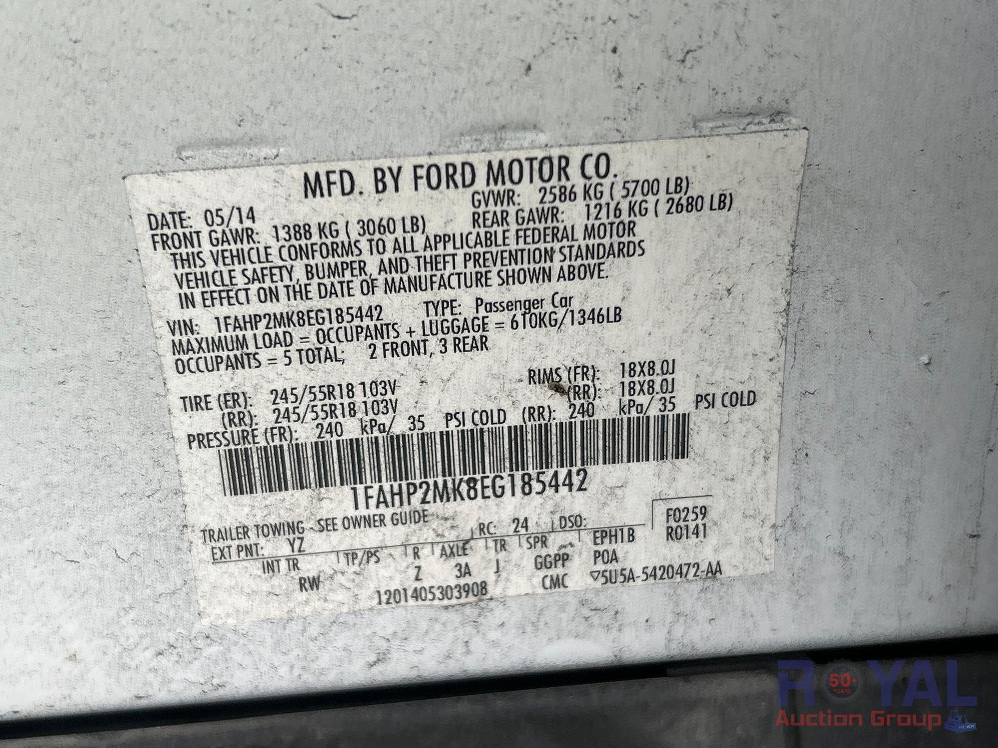 Year: 2014 Make: Ford Model: Taurus Vehicle Type: Passenger Car Mileage: Plate: Body Type: 4 Door Sedan Trim Level: Police Drive Line: AWD Engine Type: V6, 3.7L; DOHC 24V Fuel Type: Gasoline Horsepower: Transmission: VIN #: 1FAHP2MK8EG185442 Features and Notes: