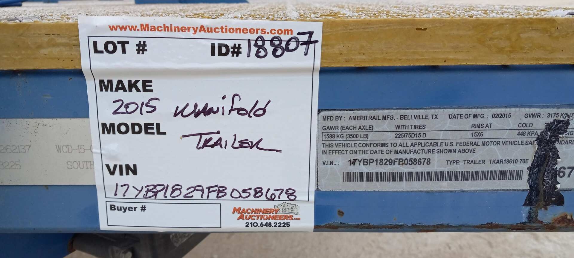 (Atascosa. TX) 2015 AMERITRAIL MANIFOLD TRAILER VIN/SN: 17YBP1829FB058678, GVWR:7,000LBS. (3.5k AXLES x 2), 7FT X 18FT, SUSPENSION: SPRING RIDE, 2IN HITCH, SINGLE WHEEL TANDEM AXLE, 265/75D15. ITEM# 18807