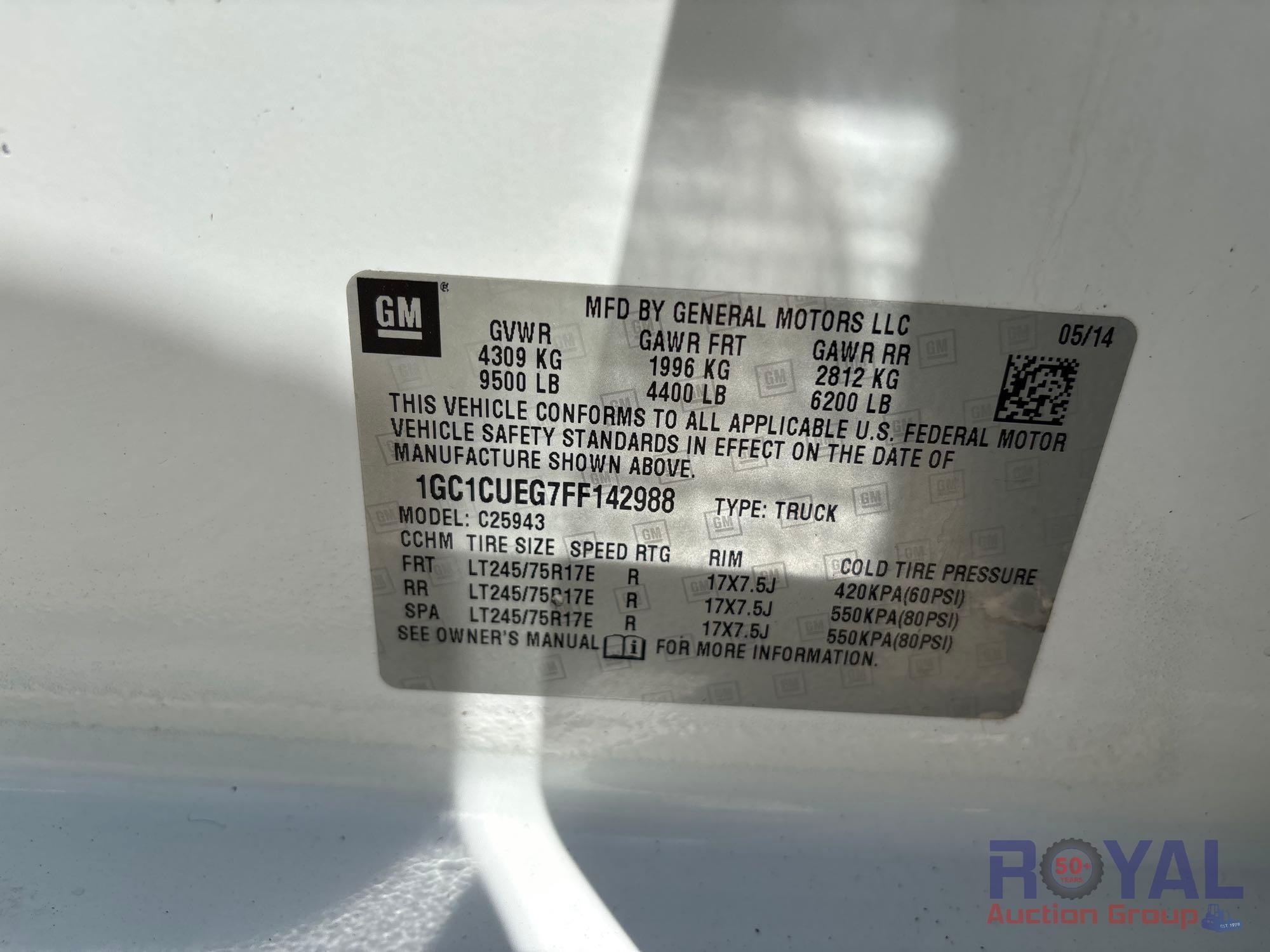 VIN: 1GC1CUEG7FF142988 Odom reads 217,304 miles. Pwd. by 6.0L V8 gas engine, automatic transmission. Equipped with tow package, bed liner, running boards, crew cab, pwr. windows, locks and mirrors, dash screen, steering wheel cruise control, digital infotainment system, am/fm stereo, heat and a/c, 12v charger. Runs and drives. Limited function check completed at check in.