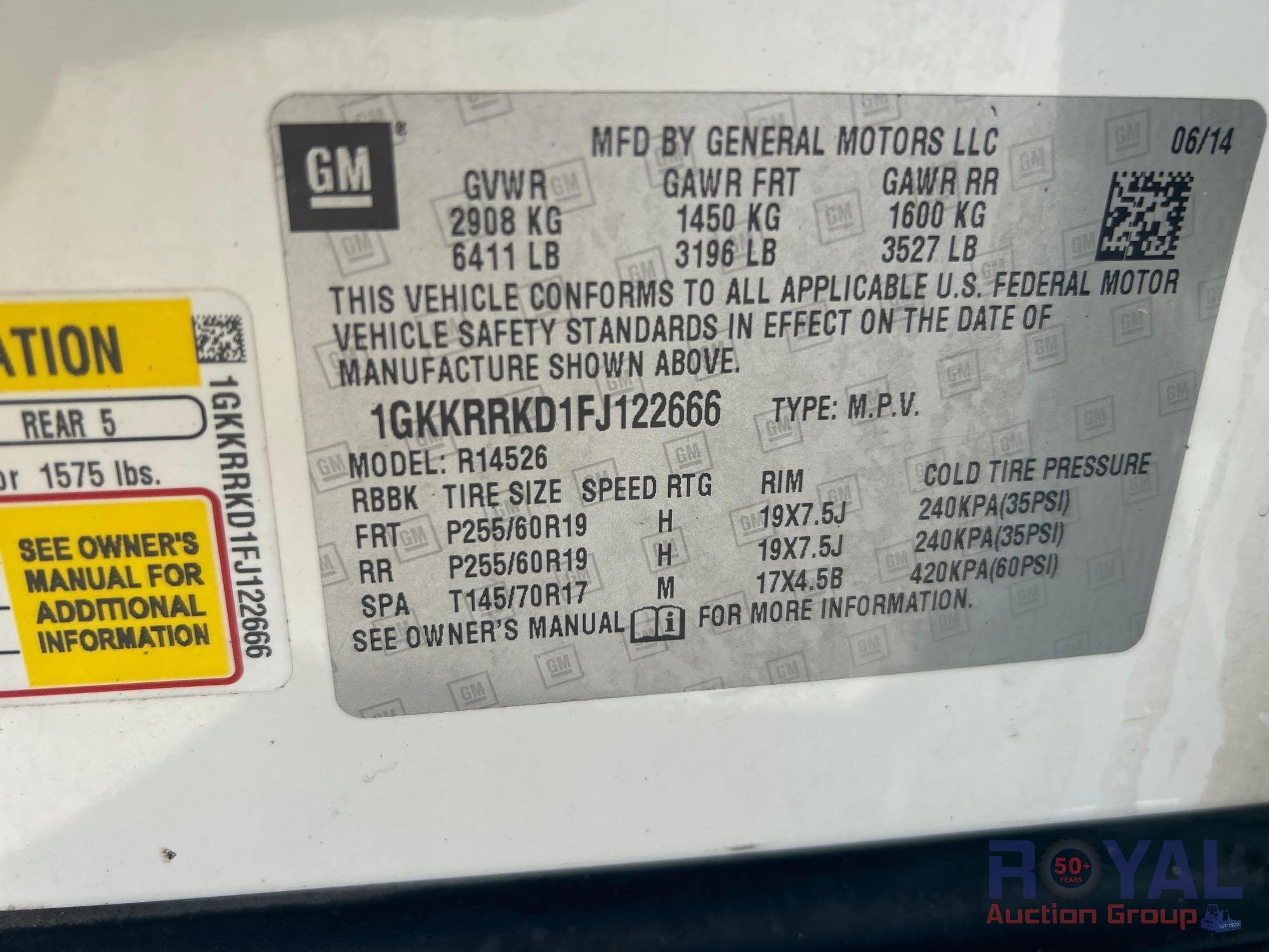 VIN: 1GKKRRKD1FJ122666, Odom Reads: 141,504 Miles. Pwd by 3.6L V6 gasoline engine, Automatic transmission, Equipped with FWD/Front Wheel Drive, tow package, third row compatible, pwd seats, windows, locks, and mirrors, steering wheel cruise controls and hands free capabilities, Bluetooth compatible AM/FM stereo with CD player, rear view camera, heated seats, sun roof, dual climate controls, heat and A/C, Runs and Drives with engine noise. Limited Function Check Completed At Check In.