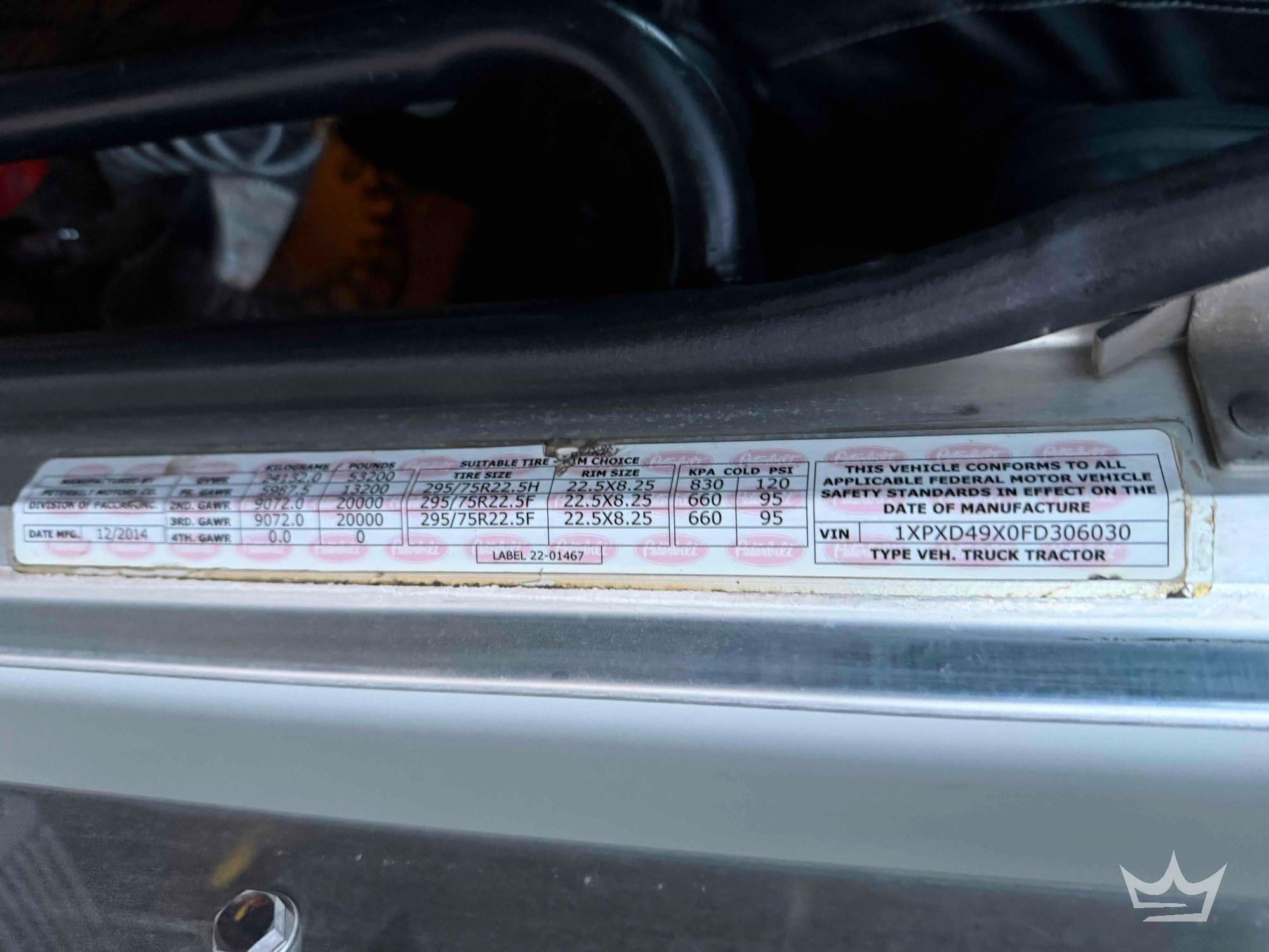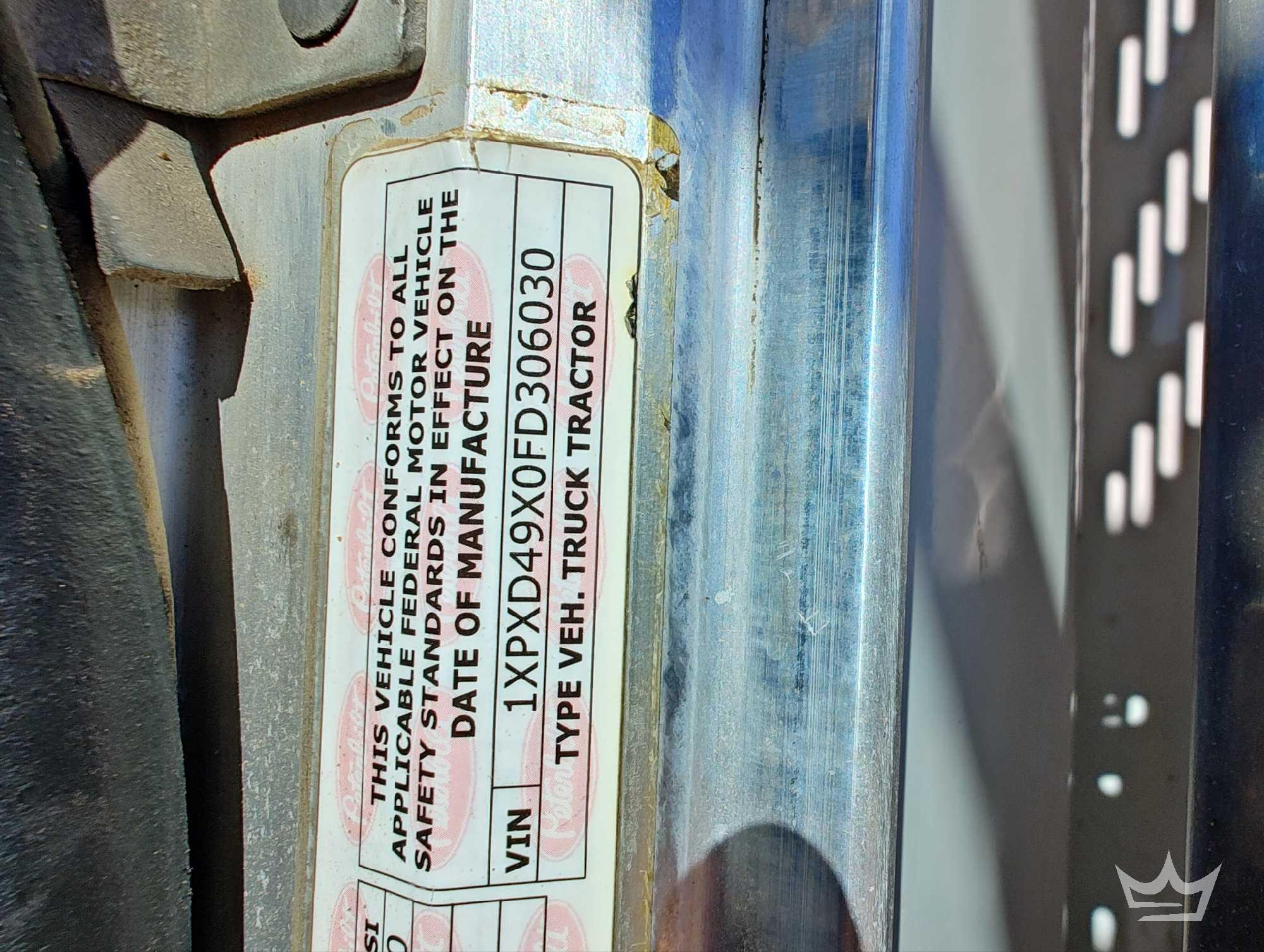 **SELLING OFFSITE IN ODESSA, TX** VIN:1XPXD49X0FD306030 Odom Reads 528,678 miles, pwd by Cummins ISX15 14.9L 485hp 6-cylinder turbo diesel engine, Eaton Fuller 13-speed manual transmission. Equipped with: sleeper cab, 5th wheel sliding plate, auxiliary hydraulic lines, tandem axle drive, air suspension, GVWR 53,200 lbs, front GAWR 13,200 lbs, int1 GAWR 20,000 lbs and rear GAWR 20,000 lbs, air brakes, trailer air supply, diff lock, air suspension lock, pwr windows, mirrors and locks, cruise control, am/fm stereo, AC/heat. Runs and drives. Limited function check completed during check in. Miles exempt on title.