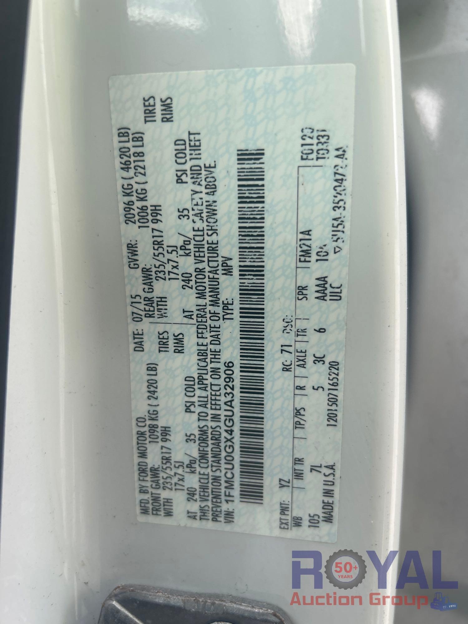 Year: 2016 Make: Ford Model: Escape Vehicle Type: Multipurpose Vehicle (MPV) Mileage: Plate: Body Type: 4 Door Wagon Trim Level: SE Drive Line: FWD Engine Type: L4, 1.6L; Turbo Fuel Type: Gasoline Horsepower: Transmission: VIN #: 1FMCU0GX4GUA32906 Features and Notes: