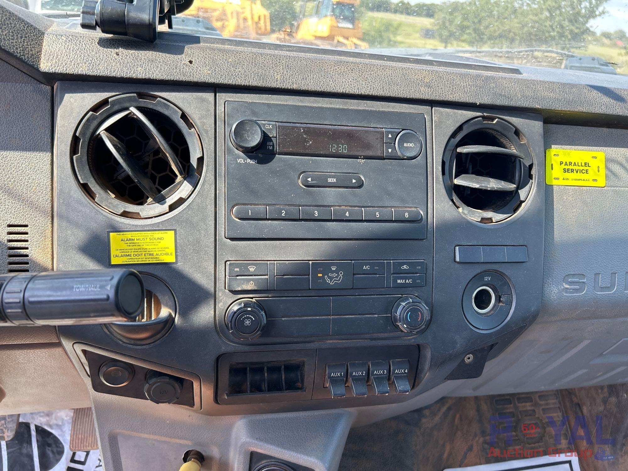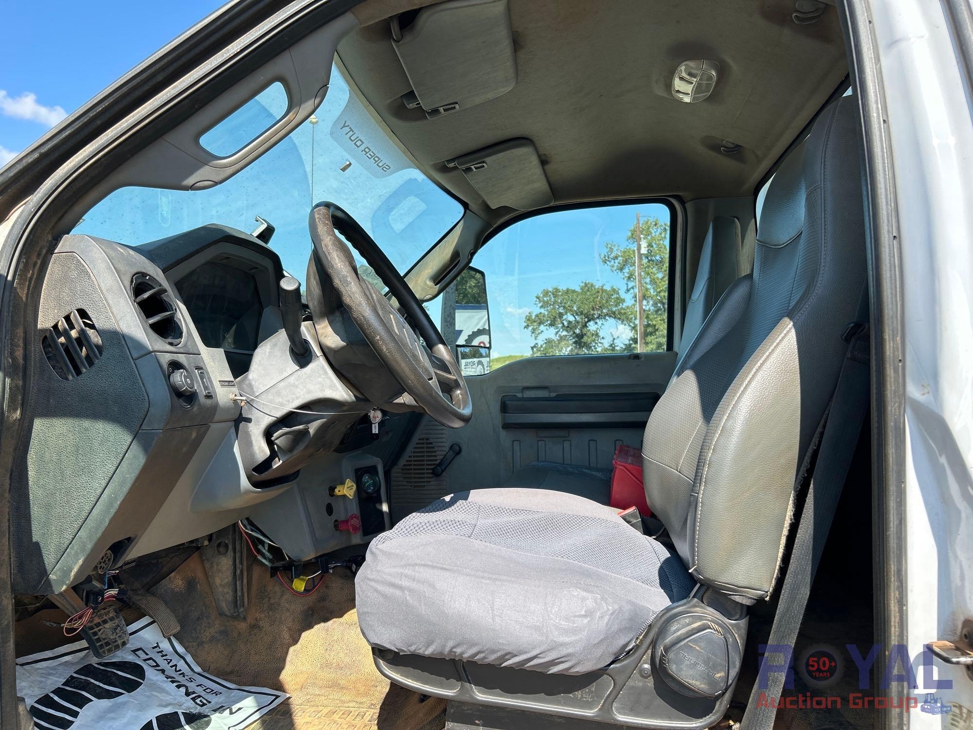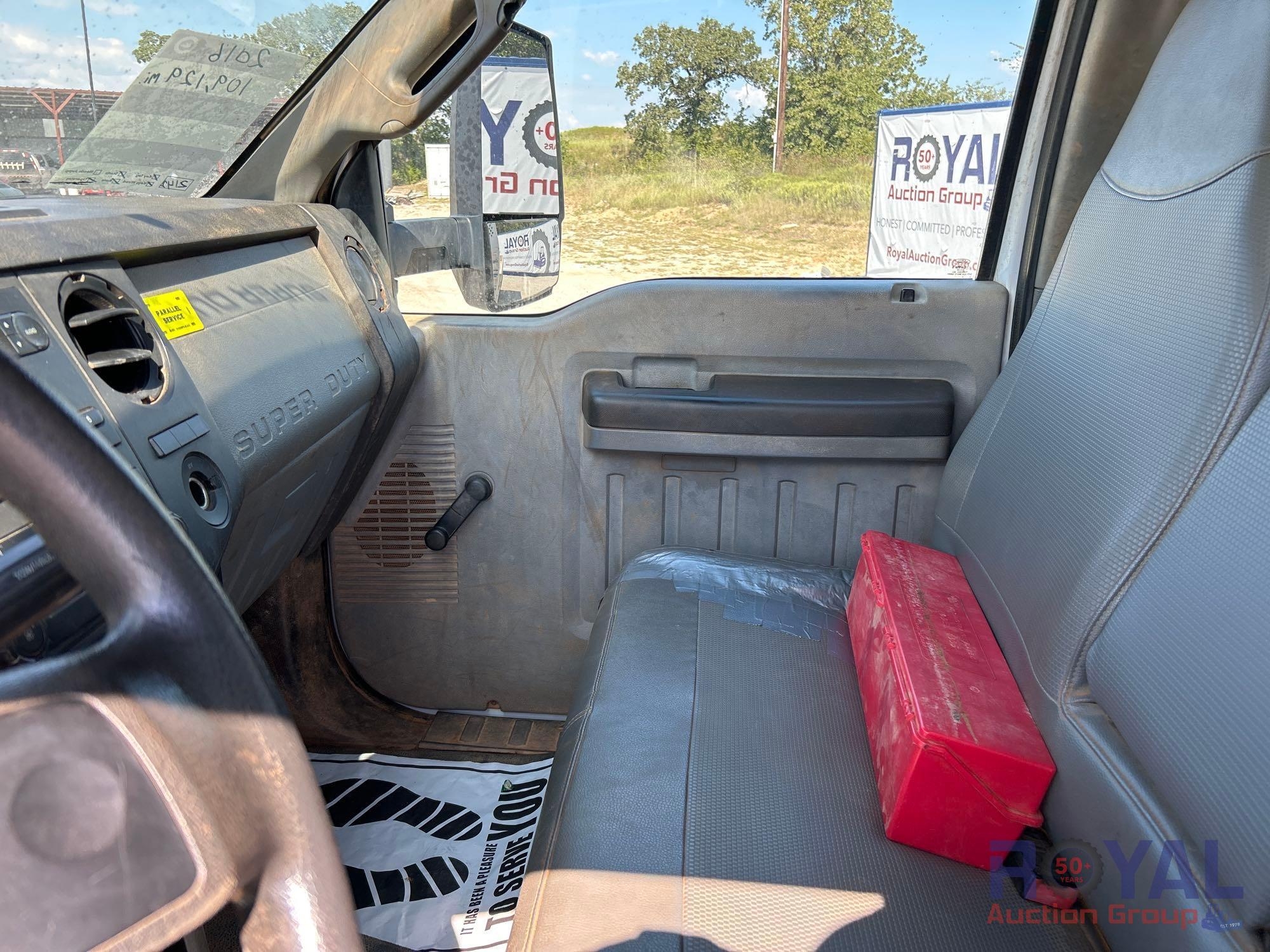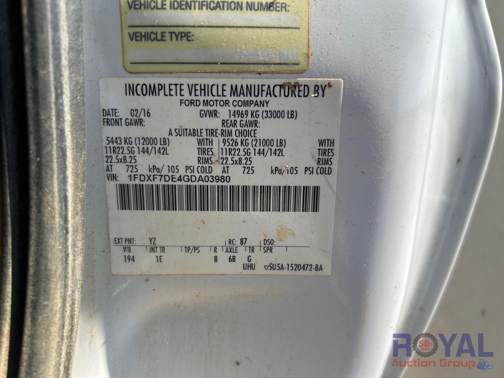 VIN: 1FDXF7DE4GDA03980 Odom reads 109,129 miles. Powered by a Power Stroke 6.7L V8 Turbo Diesel Engine, Automatic Transmission. Equipped with flatbed body with left side service storage boxes, tow package, GVWR 33,000lbs, front GAWR 12,000lbs, rear GAWR 21,000lbs, dual wheel rear axle, air brakes, trailer air supply, steering wheel cruise controls, AM/FM stereo, auxiliary switches, climate controls, AUX input, 12V charging. Runs and drives, Limited function check completed at check in.