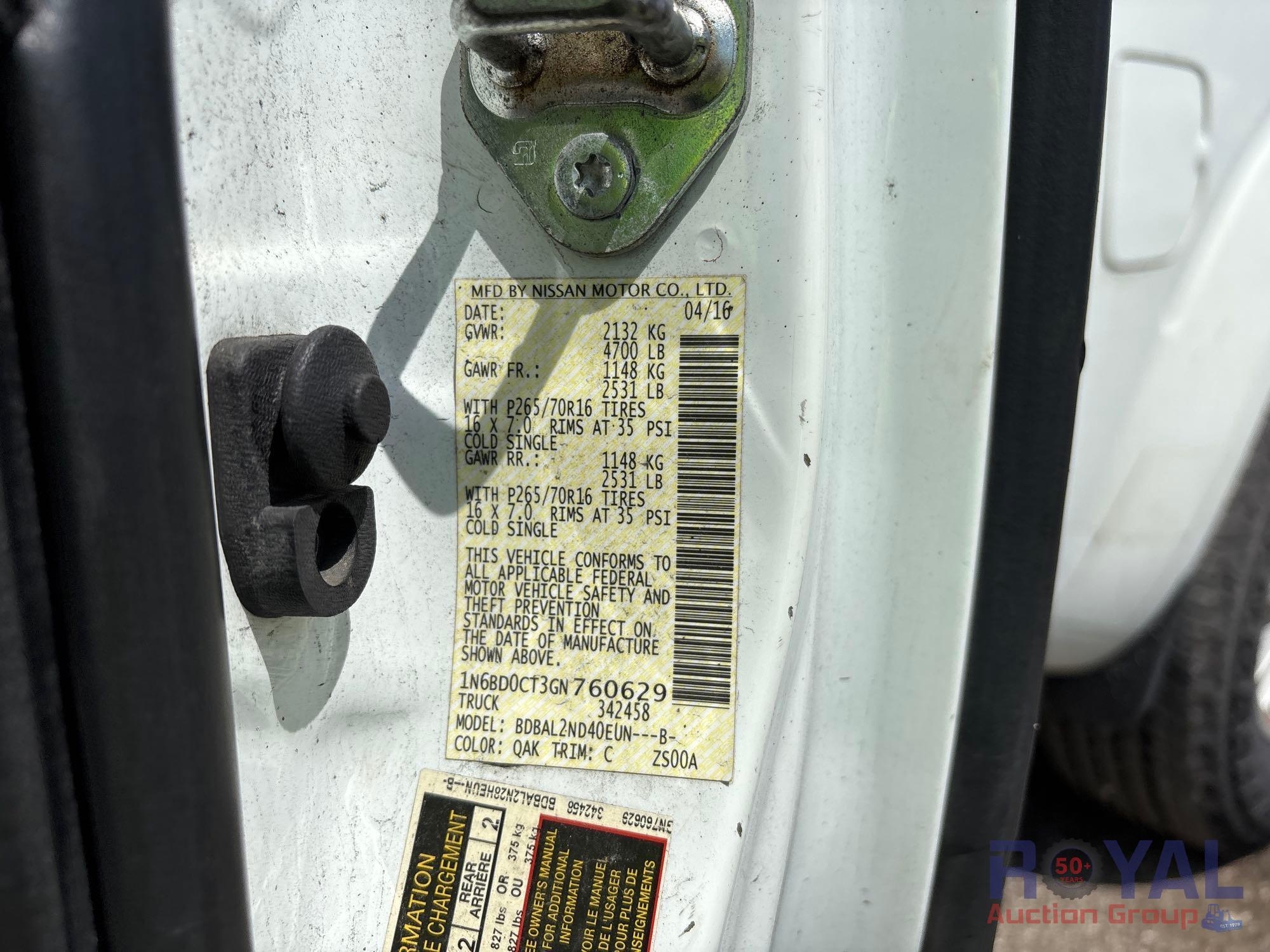 City of Ft. Lauderdale VIN:1N6BD0CT3GN760629, Odom reads: 91,957 miles. Powered by a 2.5L 4-cylinder gas engine, automatic transmission. Equipped with: bed liner, pwr windows, locks, mirrors, bluetooth connectivity, steering wheel phone, cruise controls, am/fm stereo with cd player, infotainment system, auxiliary switches, A/C/heat and 12v charger. Runs and drives.* Acceleration issue were noted during checking*. Limited function check completed at check in.