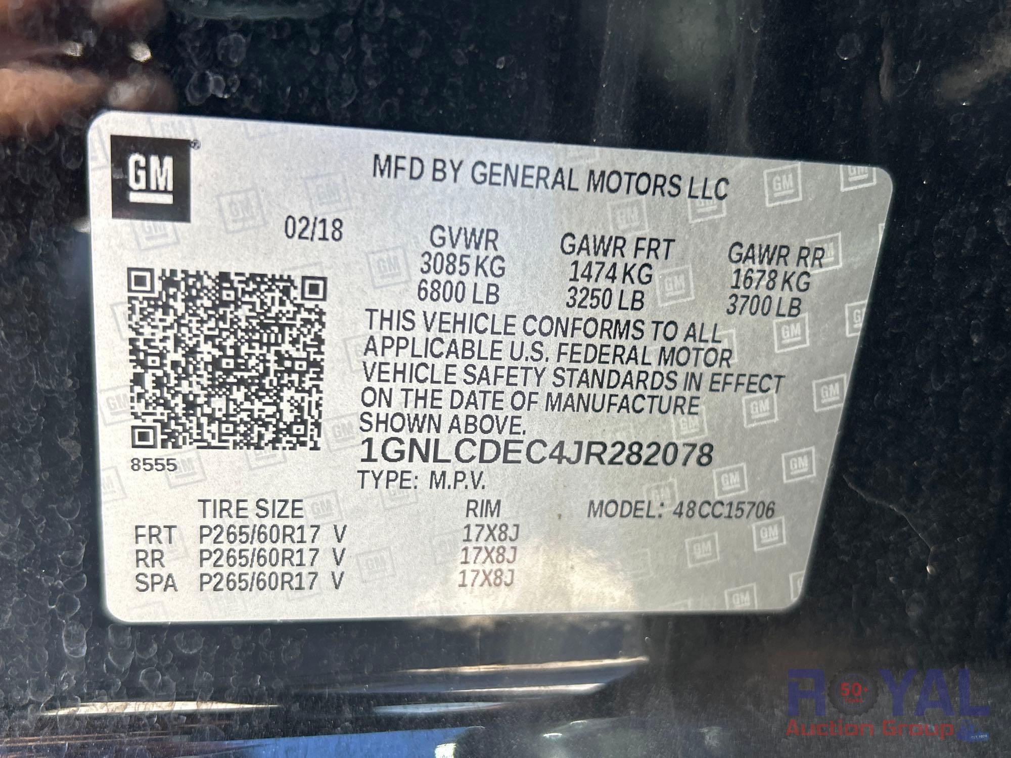 City of Largo (39-795) VIN: 1GNLCDEC4JR282078 Odom Reads: 68,244 Miles. Pwd by 5.3L V8 gasoline engine, Automatic transmission, Equipped with RWD/Rear Wheel Drive, pwd seats, windows, locks, and mirrors, steering wheel cruise controls and hands free capabilities, Bluetooth compatible AM/FM stereo with CD player, Havis Center Console with pro-gard 2-gun rifle rack,, rear view camera, spot light, dual and rear climate controls, heat and A/C, Runs and Drives. Limited Function Check Completed At Check In. Title Branded: Police