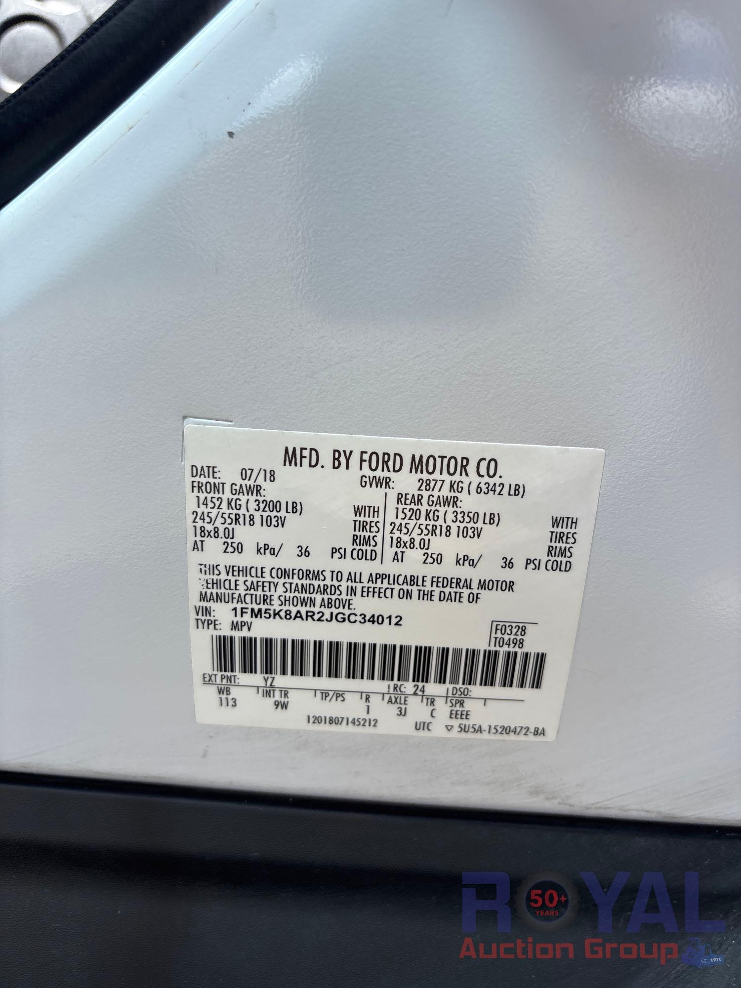 City of Ft. Lauderdale VIN:1FM5K8AR2JGC34012, Odom reads: 55,446 miles. Powered by a 3.7L V6 gas engine, automatic transmission. Equipped with: All wheel drive/AWD, tow package, pwr windows, locks, mirrors, seat, dash screen, bluetooth connectivity, steering wheel cruise, dash, and media controls, am/fm stereo with cd player, digital infotainment system, full interior, A/C/heat and 12v charger. Runs and drives. Limited function check completed at check in.