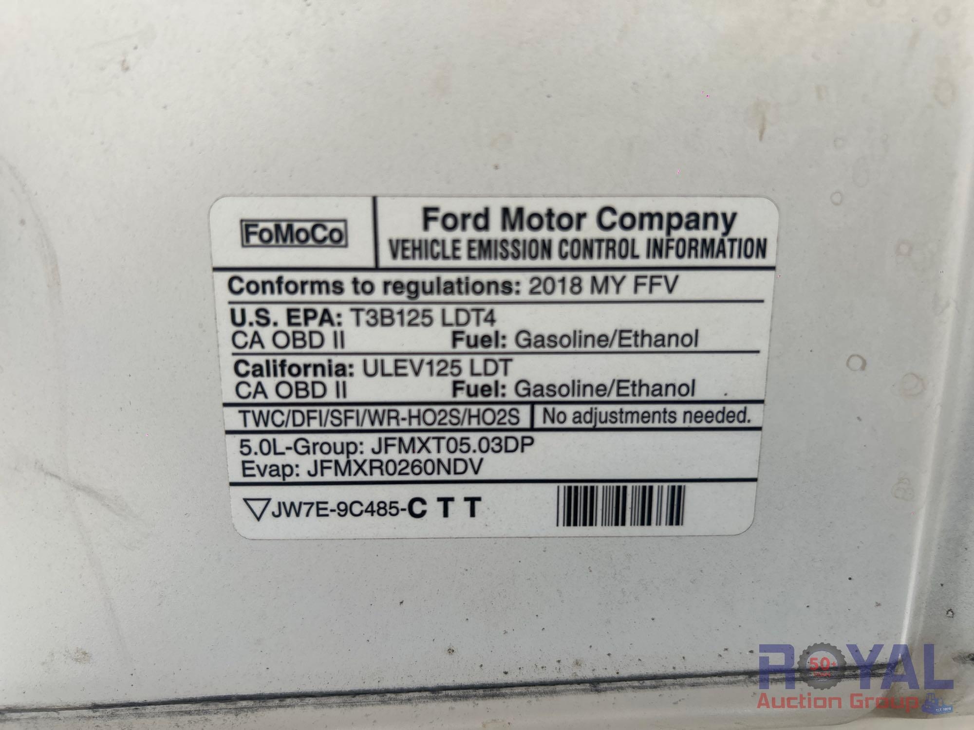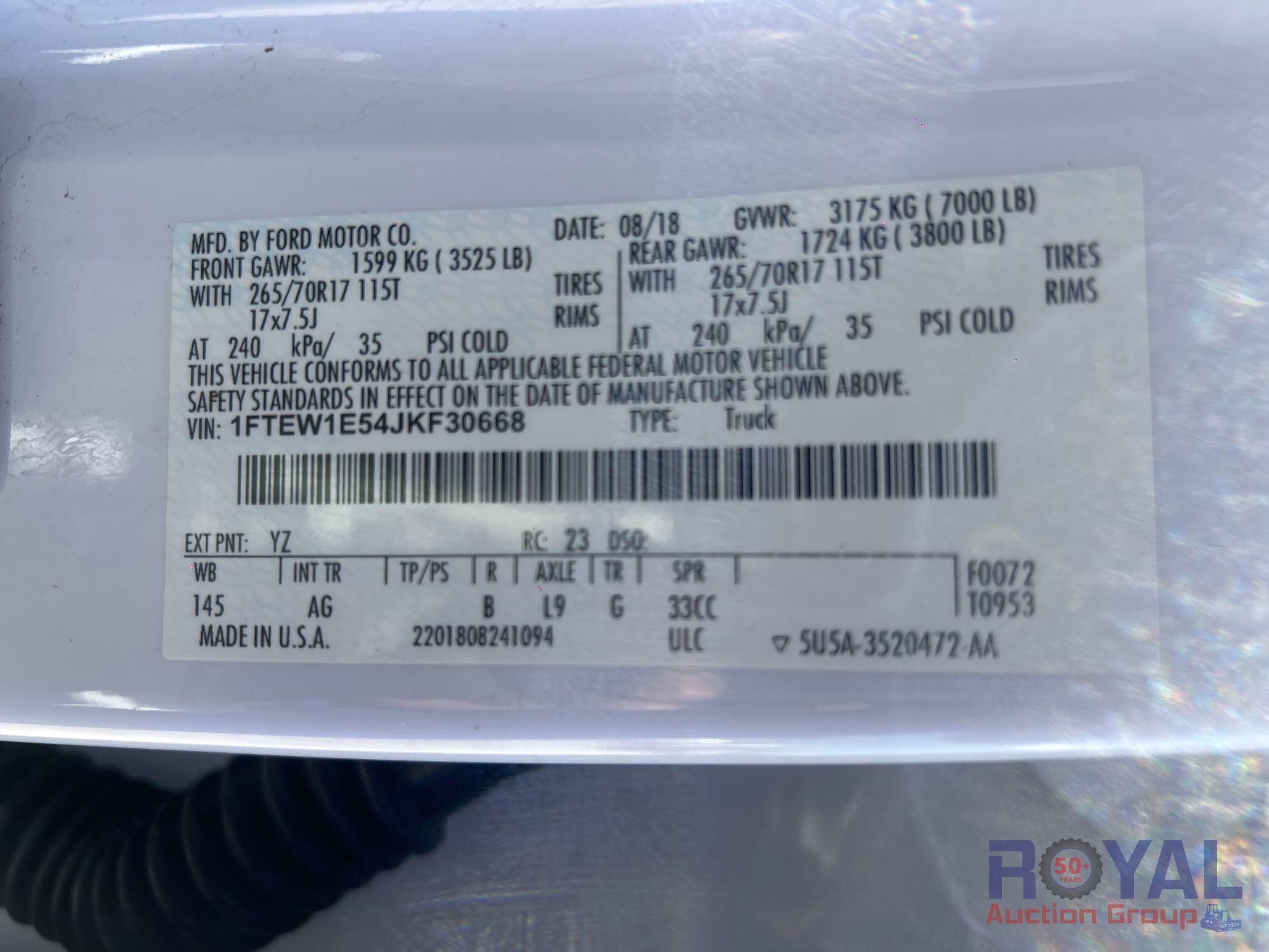 VIN: 1FTEW1E54JKF30668, Odom reads: 181,410 miles. Powered by a 5.0L V8 gas engine with an automatic transmission. Equipped with: tow package, bedliner, rear backup assist camera, pwr windows, locks, mirrors, bluetooth connectivity, steering wheel phone, cruise, dash, and media controls, am/fm stereo with cd player, digital infotainment system, AC/heat and 12v charger. Runs and drives. A limited function check was completed at check-in.