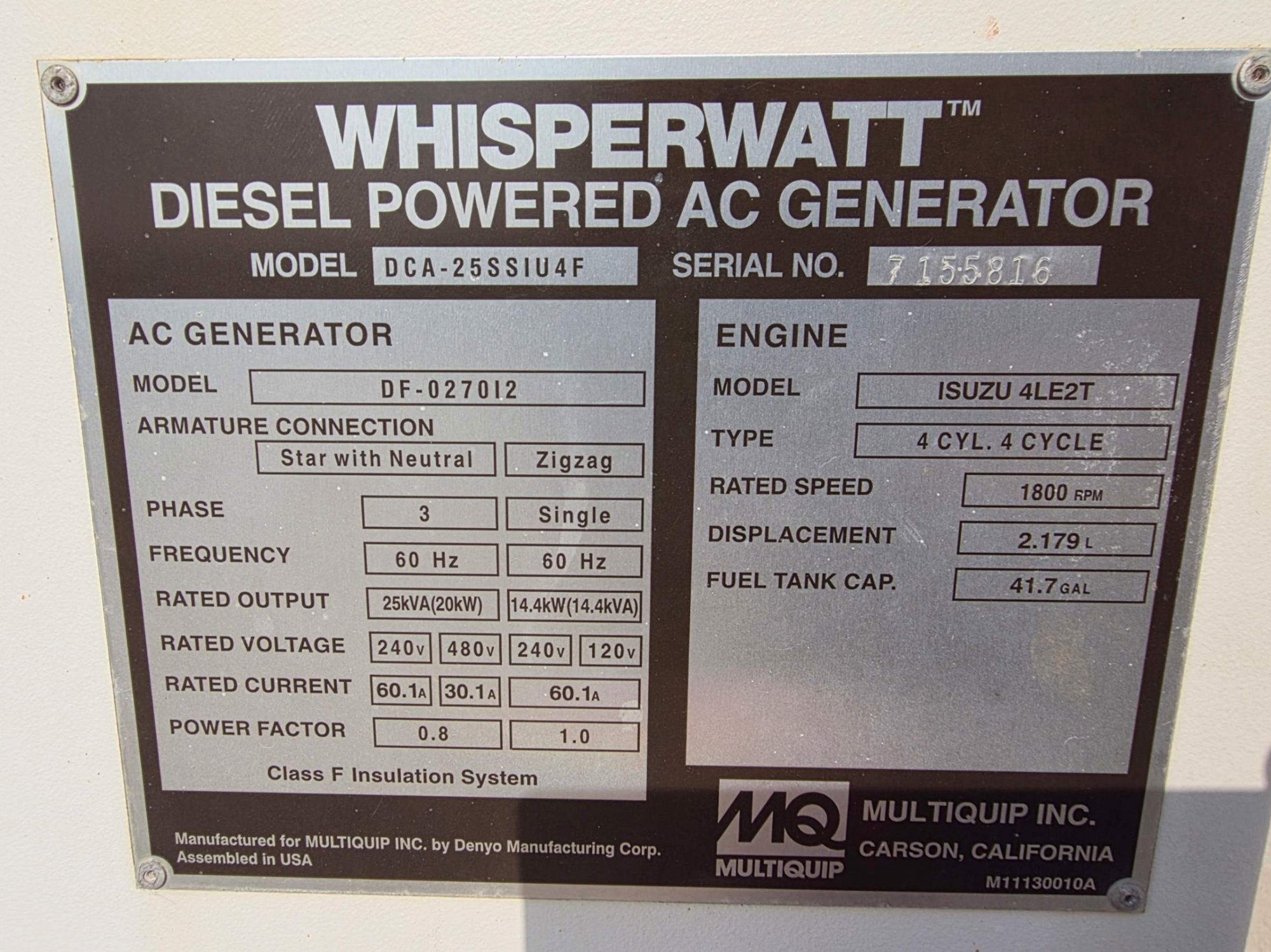(Atascosa. TX) 2018 MQ POWER WHISPERWATT DCA-25 GENERATOR GVW: 3,500LBS. (3K AXLES), ENGINE: ISUZU 2.2 LITER/37HP, (STARTS), (5,982HRS), DENYO DF-027012 GEN END, 3 PHASE, 60HZ, 25KW, 120/240/480 VOLT, 2 IN HITCH, 175/80R13. ITEM# 20398