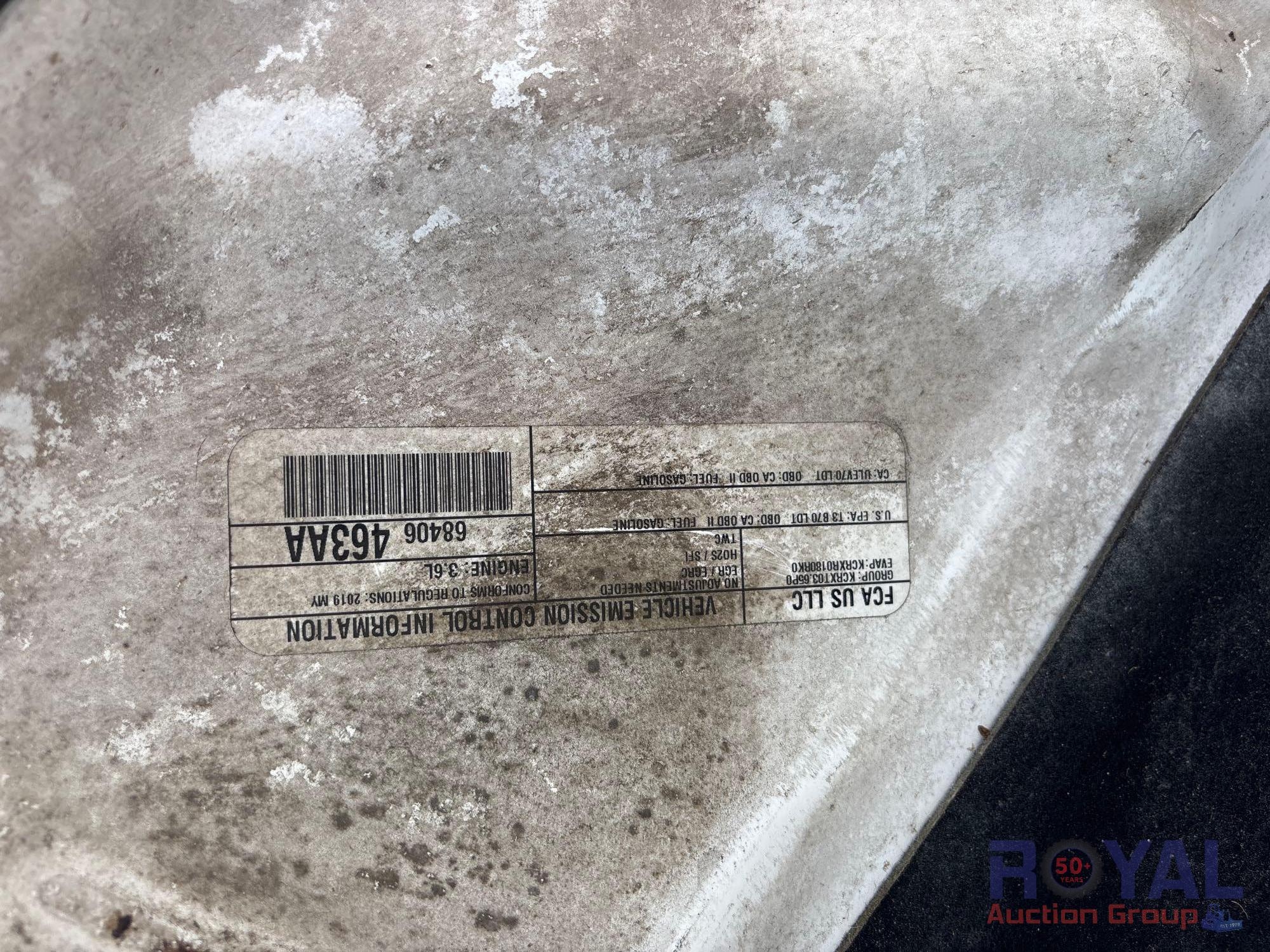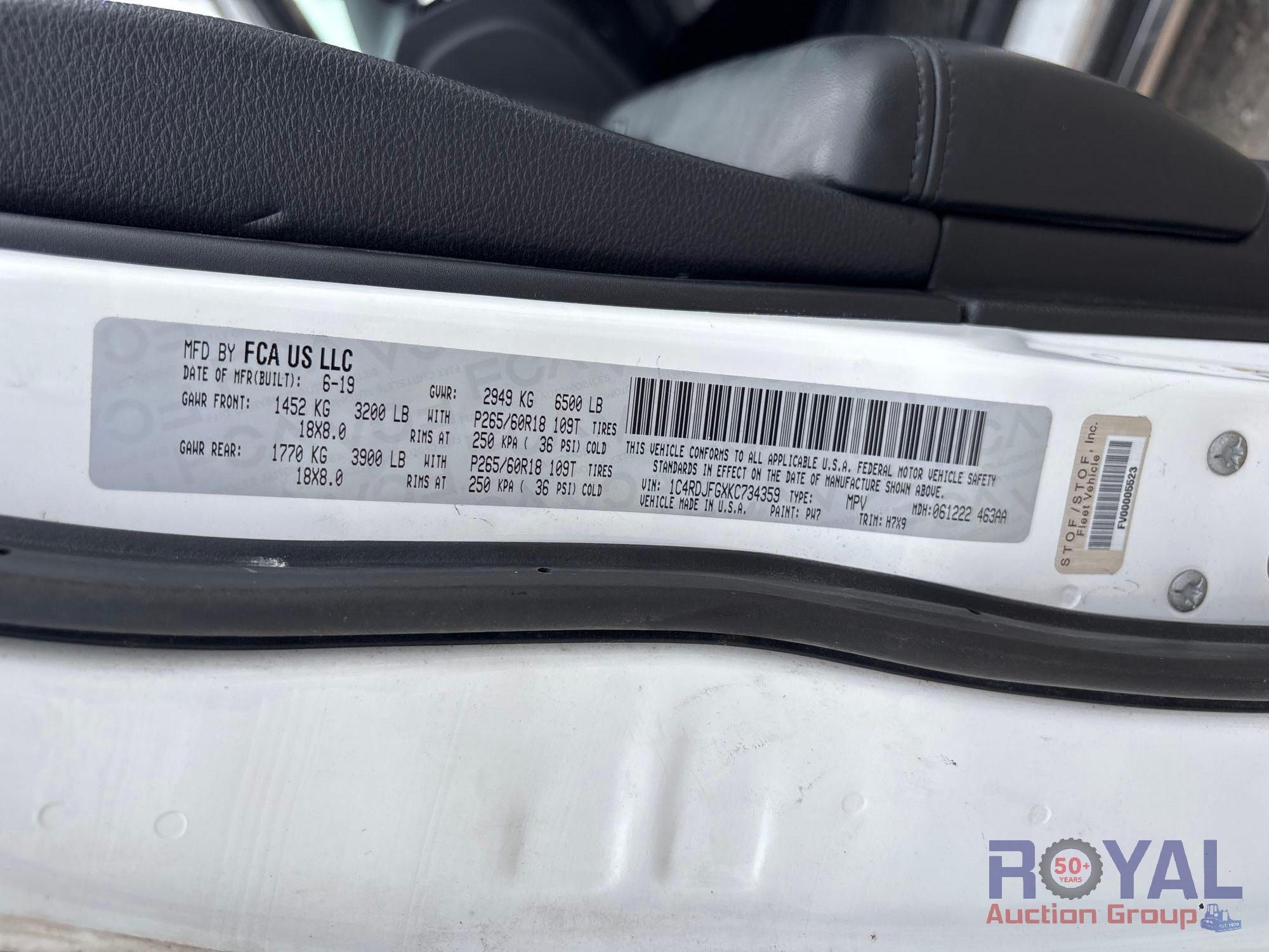 VIN:1C4RDJFGXKC734359, Odom reads124,760 miles. Powered by a 3.6L V6 gas engine, automatic transmission. Equipped with: pwr windows, locks, mirrors, seat, dash screen, keyless ignition, bluetooth connectivity, steering wheel phone, cruise, dash, and media controls, am/fm stereo with cd player, digital infotainment system, dual climate controls, and 12v charger. Runs and drives with a jump pack No acceleration was noted during check in.* Limited function check completed at check in.