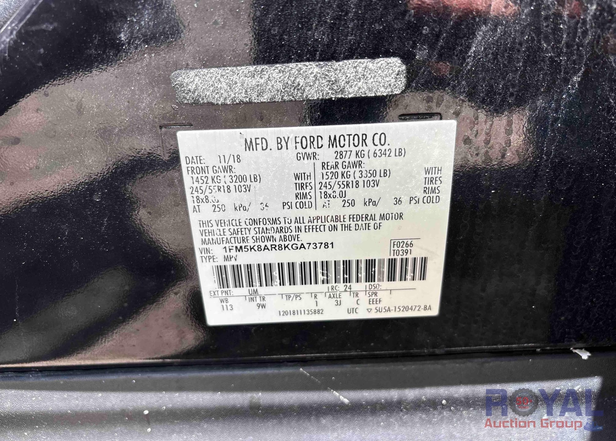 Lee County Port Authority; VIN: 1FM5K8AR8KGA73781 Odom Reads 139,818 miles, pwd by 3.7L V6 gas engine, automatic transmission. Equipped with: police interior, all wheel drive AWD, police transport rear seating and partition, front guard, pwr windows, seats, mirrors and locks, steering wheel cruise, hands free phone system, digital infotainment system w/ bluetooth connectivity and am/fm radio, AC/heat. Runs and drives. Limited function check completed during check in.