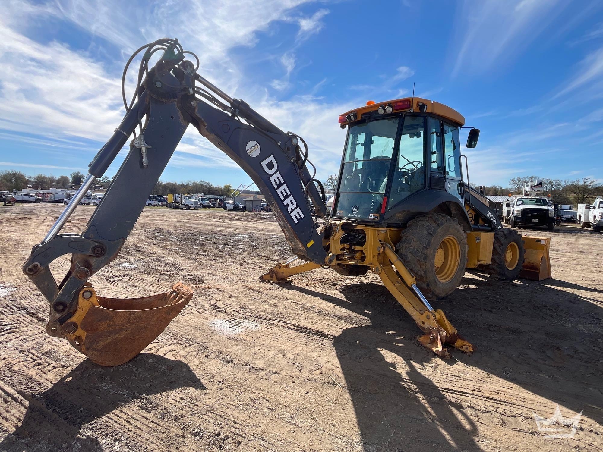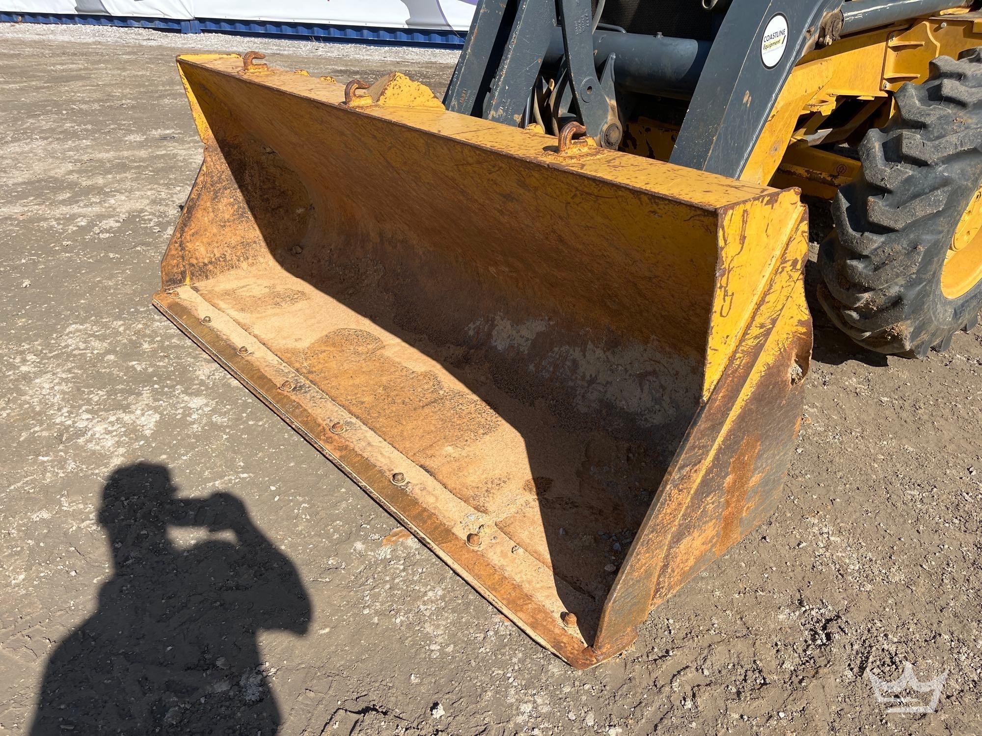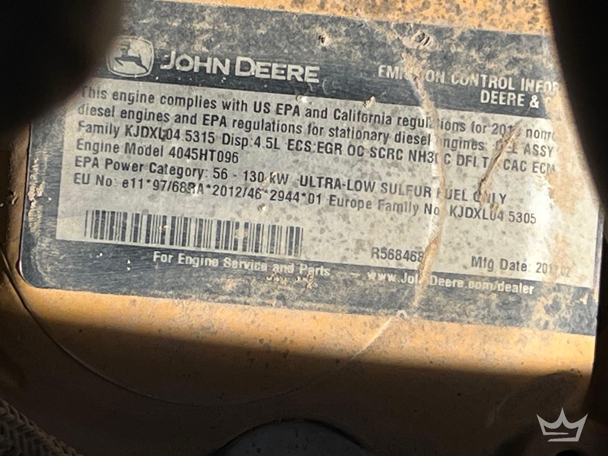 SN: 1T0310SLAKF350024, Hours Read: 5,170 hours. Pwd by a John Deere 4045HT096 4.5L Turbo Diesel Engine, PowerShift Transmission. Equipped with John Deere 1.31yd general purpose loader bucket with bolt on cutting edge, manual coupler, rear digging tooth bucket, dipper plumbed for hydraulics, dual rear hydraulic stabilizers, joystick front controls, pilot rear controls, adjustable throttle, AM/FM stereo, work lights, EROPS enclosed cab. Runs, drives, and operates, Limited function check completed at check in.