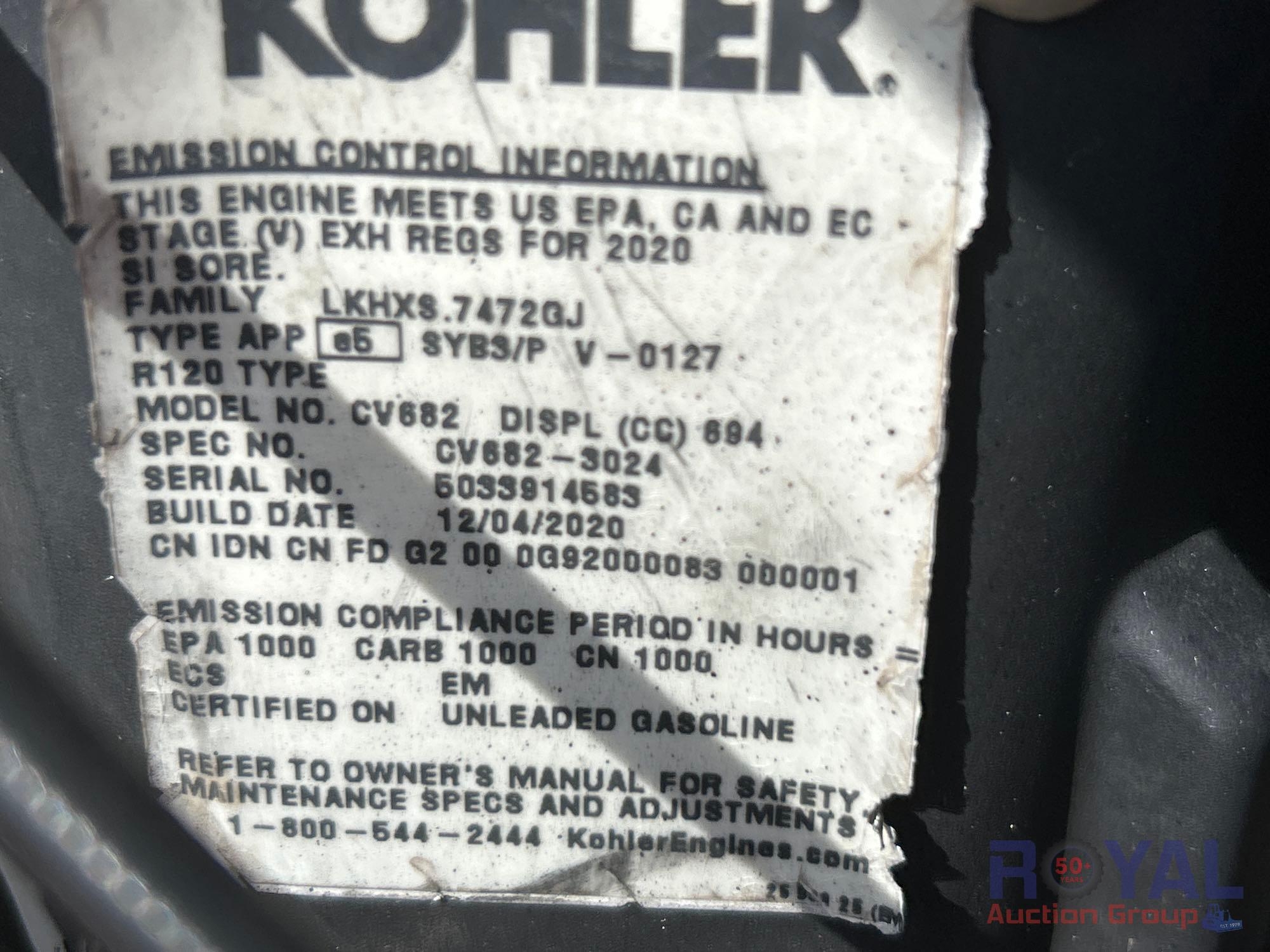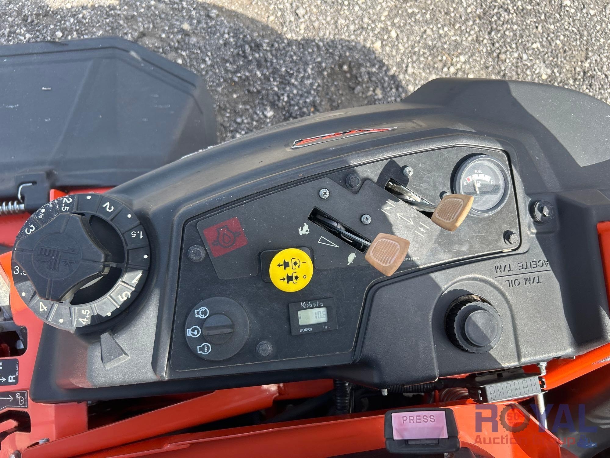 SN: KBGHGDD0CMGCA0009, Hours Read: 10 hours. Powered by a Kohler 22.5 HP Gasoline Engine, Hydrostatic transmission, Equipped with 48in deck, side discharge, belt driven deck with 3 cutting blades, foldable 2-post ROPS, High back seat with adjustable suspension, smooth lever operation, 11.6 gallons gas tank, adjustable levers and mower deck lift pedal. Runs, drives and operates. Kubota warranty until June 2026