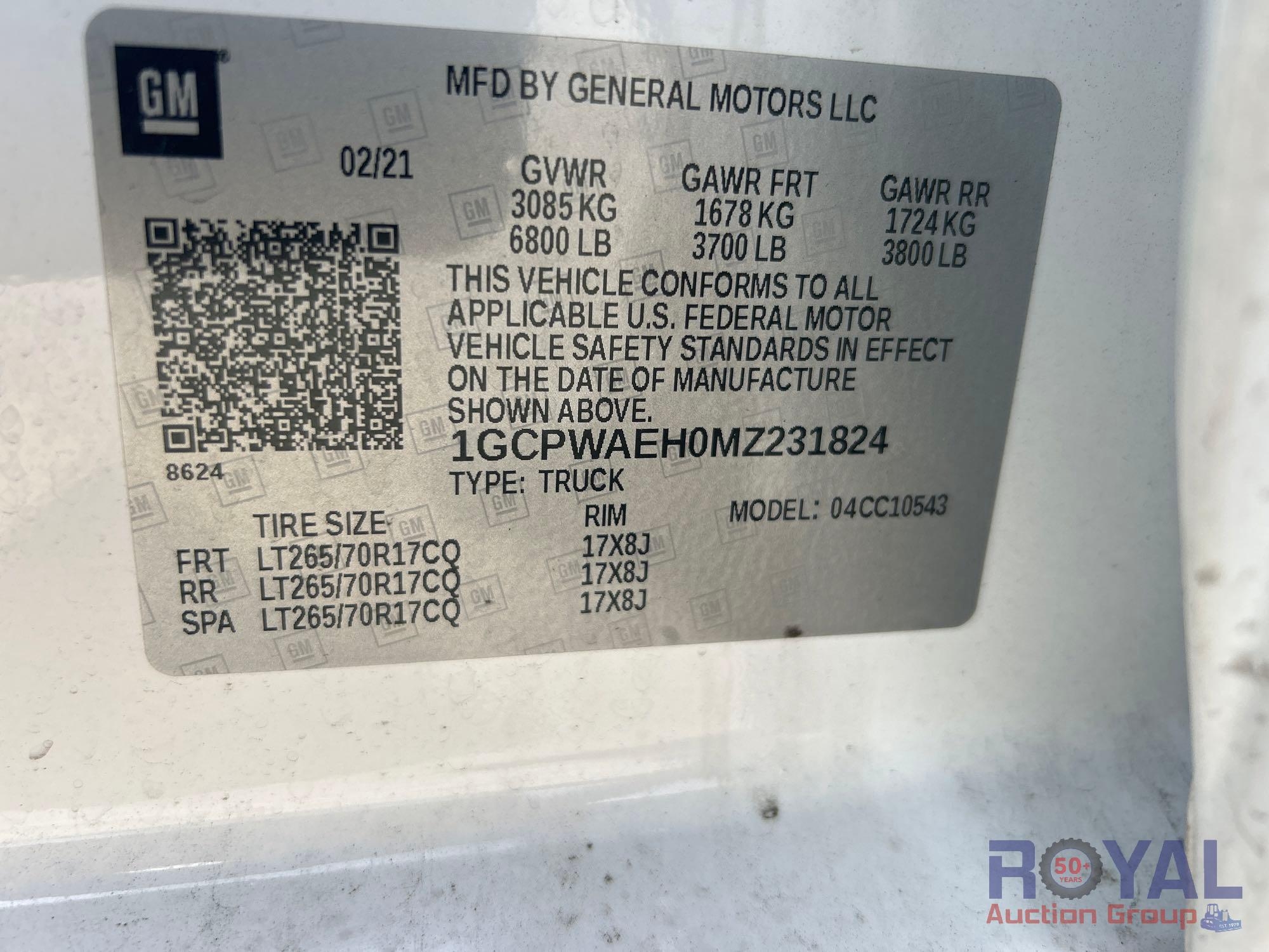 **SELLING OFFSITE AT ROYAL AUCTION GROUP ZEPHYRHILLS, FL LOCATION** Hillsborough County Sheriff (112307), VIN: 1GCPWAEH0MZ231824, Odom Reads: 19,903 miles. Powered by a 4.3L V6 Gasoline Engine, Automatic Transmission. Equipped with tow package, bed liner, side step running boards, metal cargo storage box, power windows, locks, and mirrors, steering wheel cruise controls, touch screen infotainment system, cargo light, climate controls, USB and Type C input, 12V charging. Runs and drives, Limited function check completed at check in.
