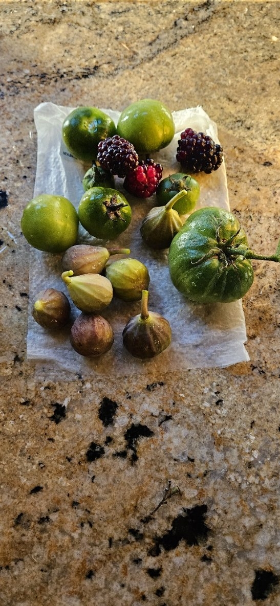 I picked a few Fall Gold raspberries in our yard yesterday while burning tax papers. Saw some wild strawberries in the grass as well.We got hit with army worms on the tomatoes, about half the crop was mangled.