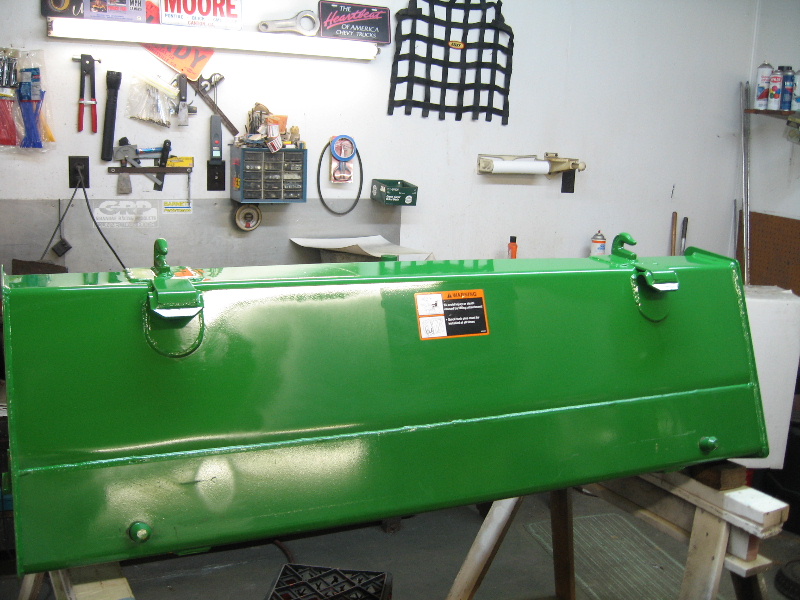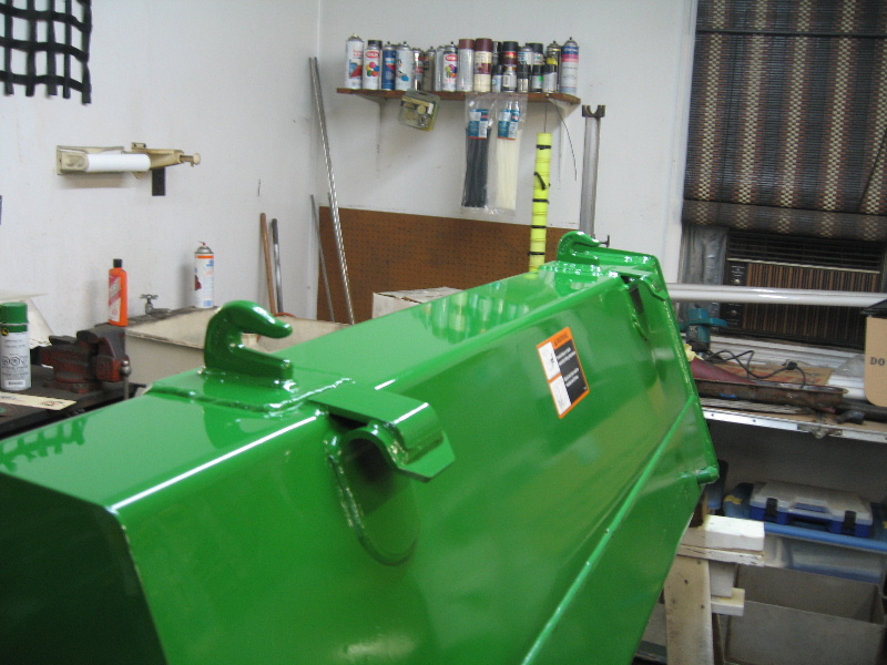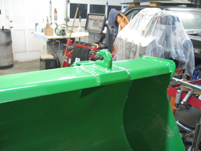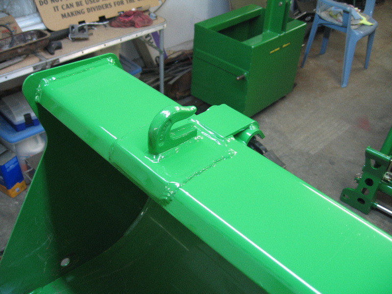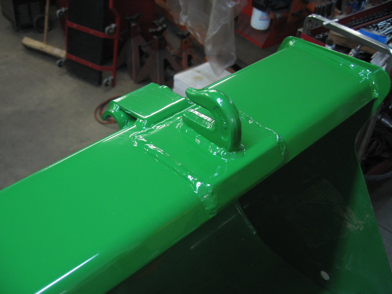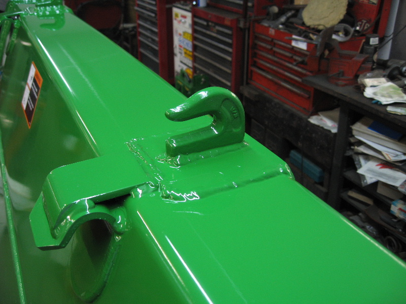 Well i figured the new 2520 needed some bucket hooks. So i called AW-direct , and had them send me 2 grade 70 3/8 hooks. there rated at 6,600 pounds. no danger in me ever hurting them with a 200CX loader. or any loader for that matter. Well i new the loader bucket was not up to heavy tasks. so as you will see from the pictures. i put two 1/4 inch gussits under the full length from front to back under the loader cuff. as that where i figured the bucket was the strongest. so thats where i decided to put the hooks. I welded a 1/4 inch plate 4X6 on top of the bucket. then as you see i wraped another band over the lip of the bucket. so if your chains were pulling down you would not bend the lip. then i welded the hooks on. and of course repainted the bucket. inside the bucket i just grinded it smooth and painted. no need to spend a whole lot of time on it. as the first scoop of dirt and it wont matter much. The top side is a different story. i spent several hours blocking and sanding the top. it is slicker now than it was new. I know its going to get scratched sooner or later. but it being a new tractor. i could not do it hafe way. it had to look good. there is no danger in me ever bending the top edge of this bucket with a 200CX . I cant say enough about the factory JD paint. it is 9 dollars a can. but it is the finest spray paint i ever used . it go's on smooth and matches perfect.
