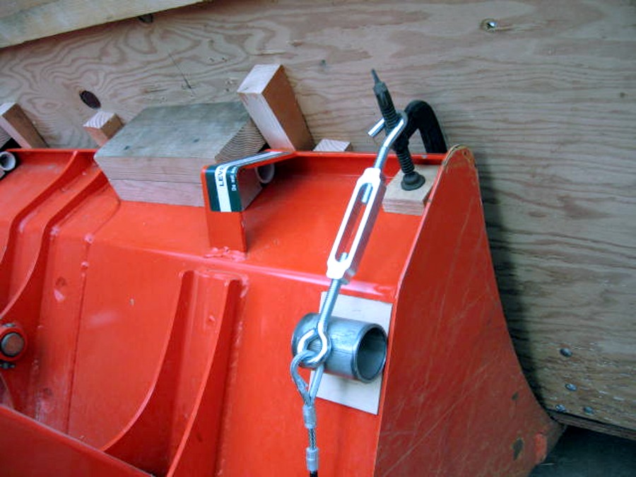 Main attachment is a cable and turnbuckle assembly that "sucks" the two buckets together. When I install my bucket forks I'll get the common, not weld-on, chain hooks so I can use the hole in the back for this attachment. But the "C" clamps worked fine too. The turnbuckles were what I had (too long) so the pipe spacer was added to keep the lead fair.