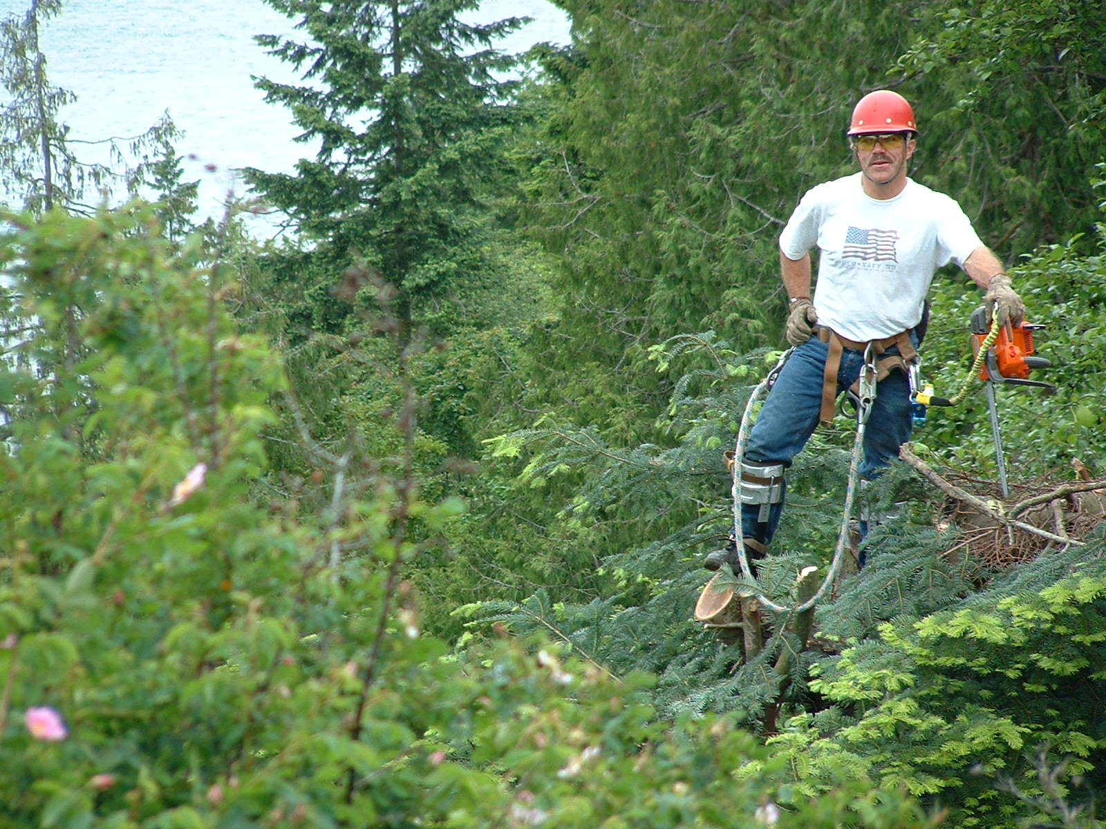 There have been times when I was a good bit on the scared side stepping out onto the climbing spurs and rehooking my flipline around the trunk. Now I always have two fliplines. One around the trunk and the other to reset for the next move.