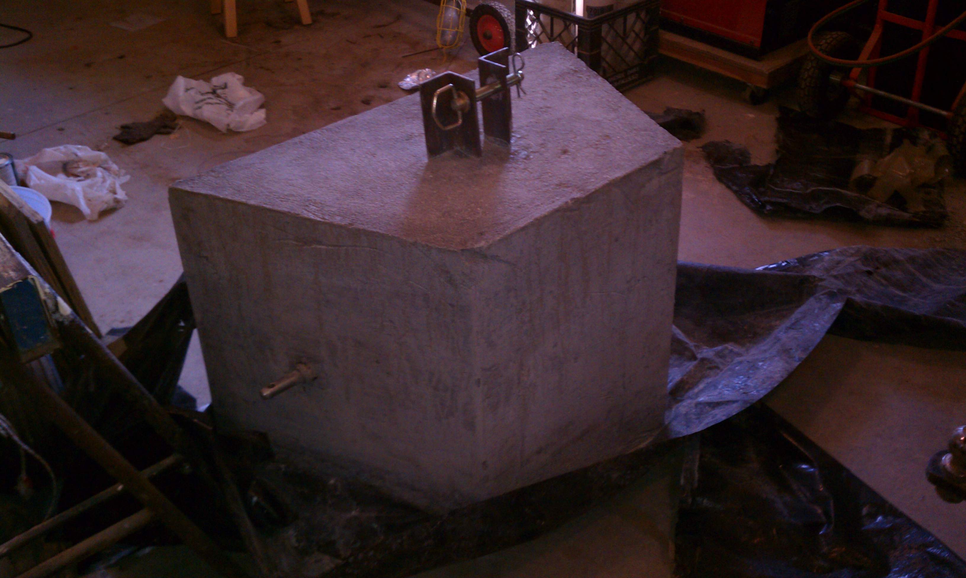 I built the mold based on measurements taken from the 3ph of the tractor while the arms moved throughout their range of motion and allowing some extra space (1"). The forms consisted of 3/4" plywood, lined with plastic, with 2x4s attached endwise on the top and bottoms. The 2x4s were staggered so the side forms sat on top of and below the end forms. Three sheet rock screws through every joint from the same orientation so the forms could be taken apart once the concrete had set. The entire form was placed on a plastic sheet and the bottom was weighted down to prevent any lifting during the pour. There is rebar throughout the block and the center angle iron attachment extended 12" into the concrete with rebar welded that extended to near the bottom (24"). In addition, there were rebar welded perpendicular to those extensions that went sideways into the concrete block. Make sense?