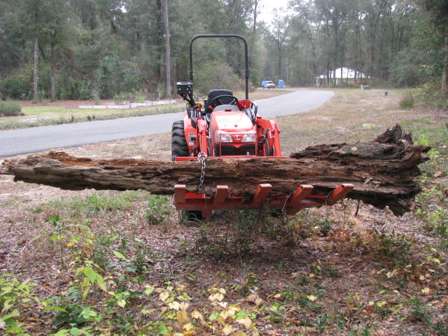 2. Moving logs with FEL: Grapple or Chain Grab Hoods on bucket plus 5/16" Grade 70 chain with Slip Hook on one end, Grab Hook on the other. You must have ballast on the Three Point Hitch.
