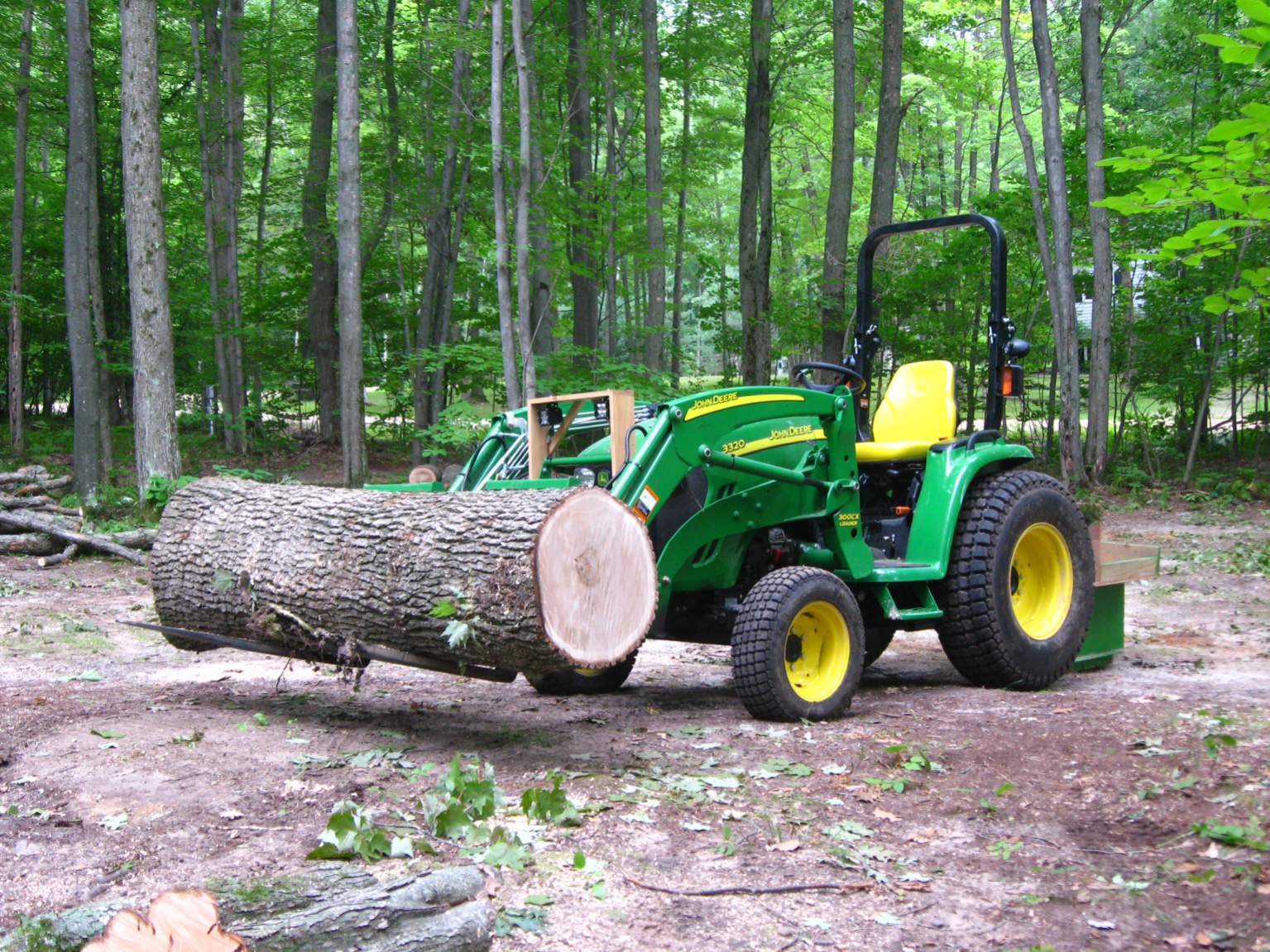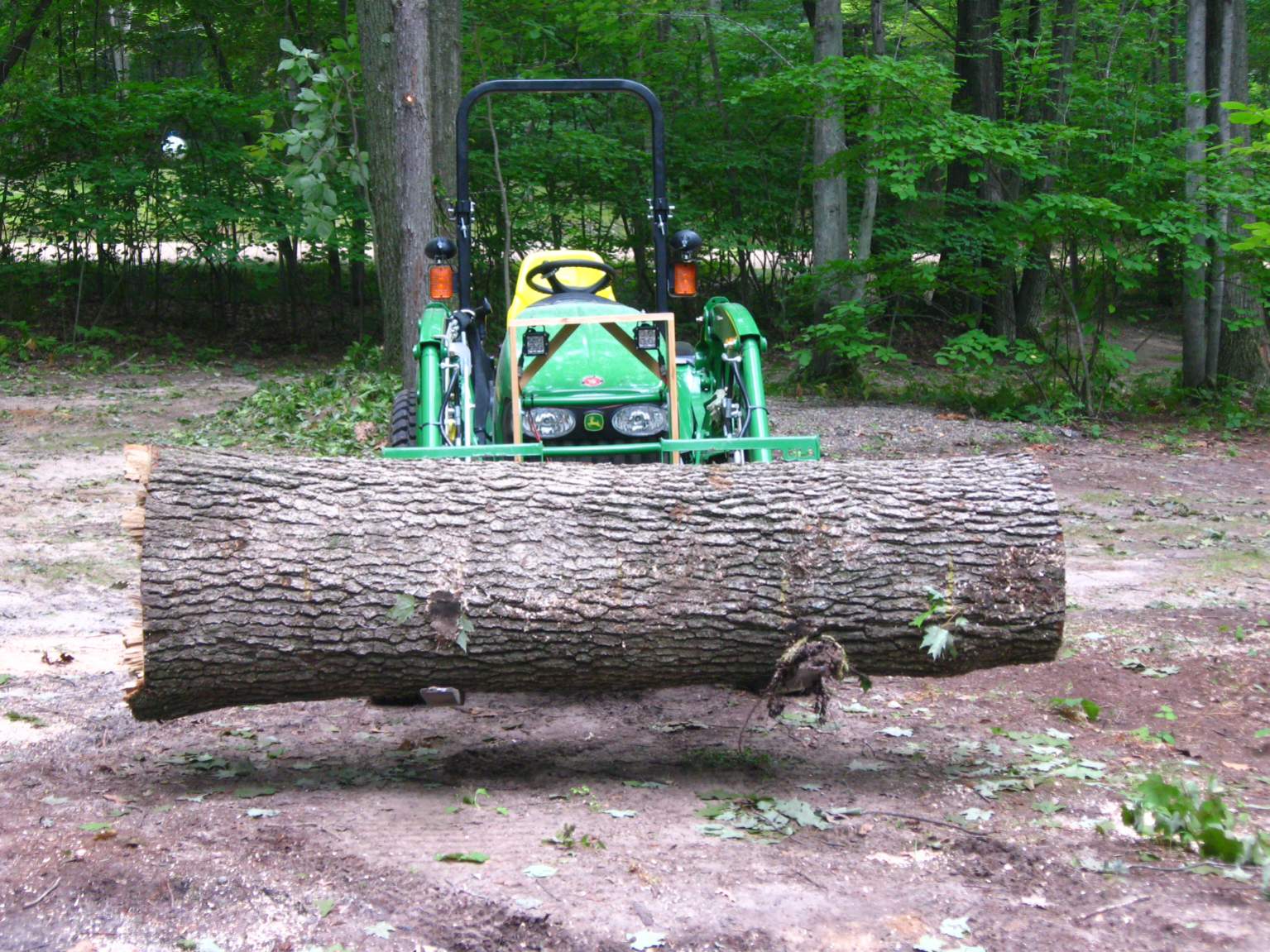 Needed to take down a large White Oak to make room for our camper and open up the woods a little. Tree measured 34-37" in diameter and will end up making a lot of firewood and few pieces of woodworking projects. This was as far as it would lift the log, and needed 4-wheel drive as the back tires would spin without it. Probably could have used a few hundred more pounds of ballast to balance better, but I only needed to move it 25 feet for now.