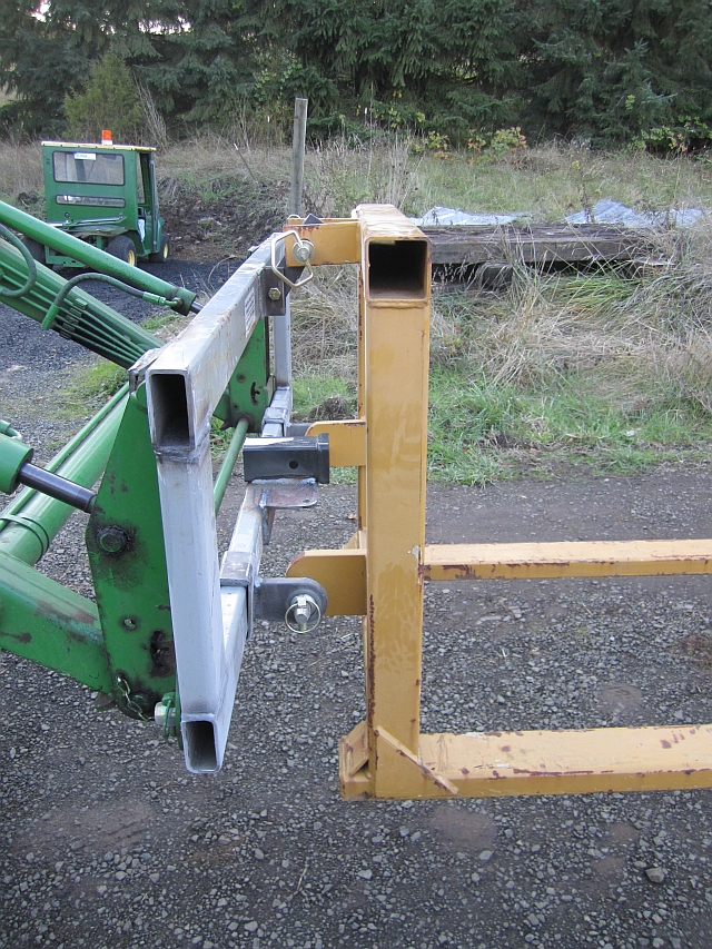 I needed a fork attachment for my FEL, but didn't like the prices. Decided to make an attachment I could use my 3pt fork attachment and move or use the others I have off the front for getting into tight places with more finesse. I added some hooks and a 2" receiver for moving around trailers and mounting a winch. My 410 loader has a removable bucket and a quick attach system, but JD wanted 1400 plus for a blank attachment plate. So DIY time!