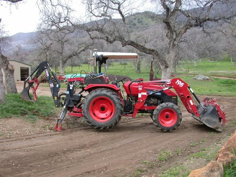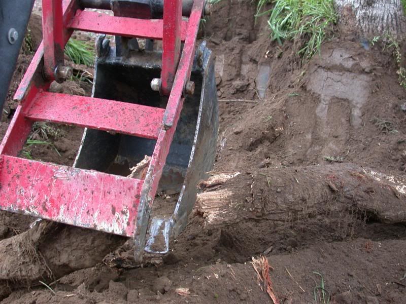 We ended up facing the garage sort of right at it. So it's just an another accident waiting to happen. You can see the little Nardi backhoe has lifted my 55hp Kama off the ground. With loaded tires, it's pushing 8,000lbs. There is also a shot of the backhoe tearing through a 4" Oak root. You can see I dig with the articulating mechanical thumb I built for it. I never take it off and it works great for picking up logs and rocks. Sort of like the bucket grapples on the tractor's FEL.